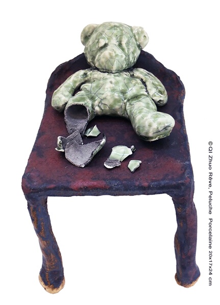 在延续中国传统的制陶技术(例如唐三彩)的同时,齐倬用自己独特的方法论给工艺秩序带来了理念上的颠覆。为了在巴黎的首次个展,他用近乎极端地方式将雕塑及物品进行“陶瓷化”的改造。花瓶被扭曲,融化,倾斜。玩具熊为陶土凝固而发生质的转化,因而变得更加脆弱。