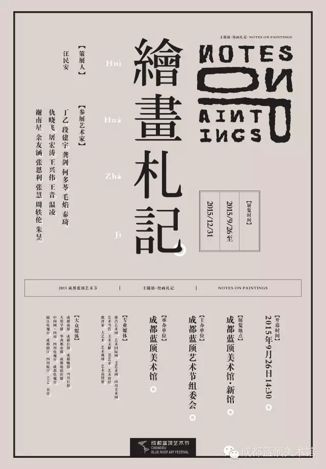 由成都蓝顶艺术节组委会主办的“2015成都蓝顶艺术节”主题展《绘画札记》将于2015年9月26日下午14:30,在成都蓝顶美术馆新馆正式开幕。