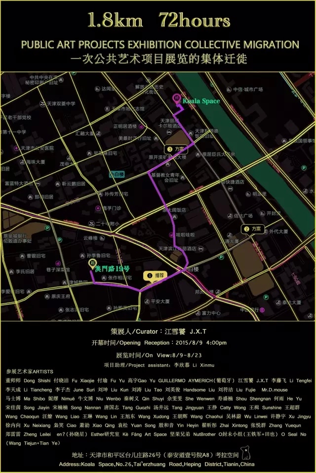 一部分艺术家作品方案已经在现场完成,一部分艺术家作品方案正在现场创作中,一部分艺术家作品方案还没有来得及实施。迁徙(migration)原指鸟类迁徙(migration of birds);是鸟类遵循大自然环境的一种生存本能反应。此次公共艺术项目也遵循了生存本能反应,选择了集体迁徙。迁徙距离1.8km,迁徙时间72小时。