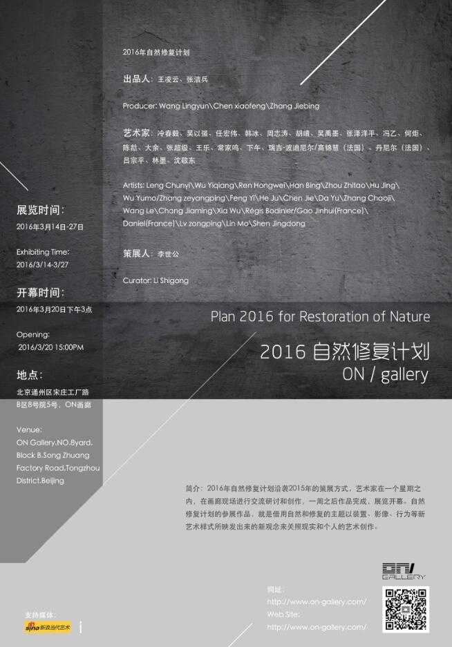2016年自然修复计划沿袭2015年的策展方式,艺术家在一个星期之内,在画廊现场进行交流研讨和创作,一周之后作品完成,展览开幕。自然修复计划的参展作品,就是借用自然和修复的主题以装置、影像、行为等新艺术样式所映发出来的新观念来关照现实和个人的艺术创作。