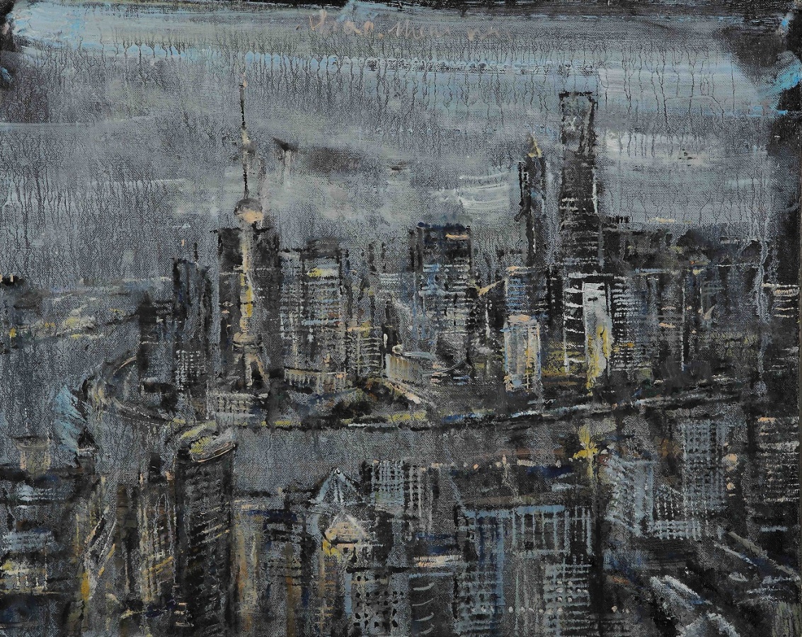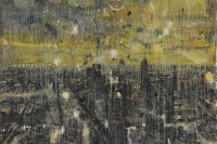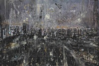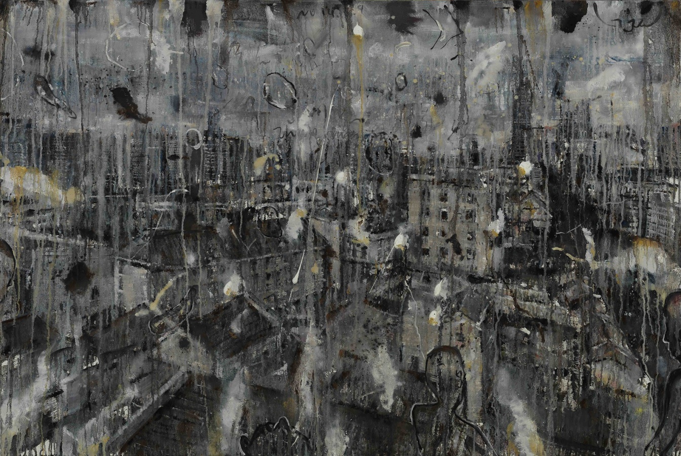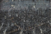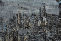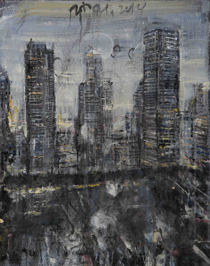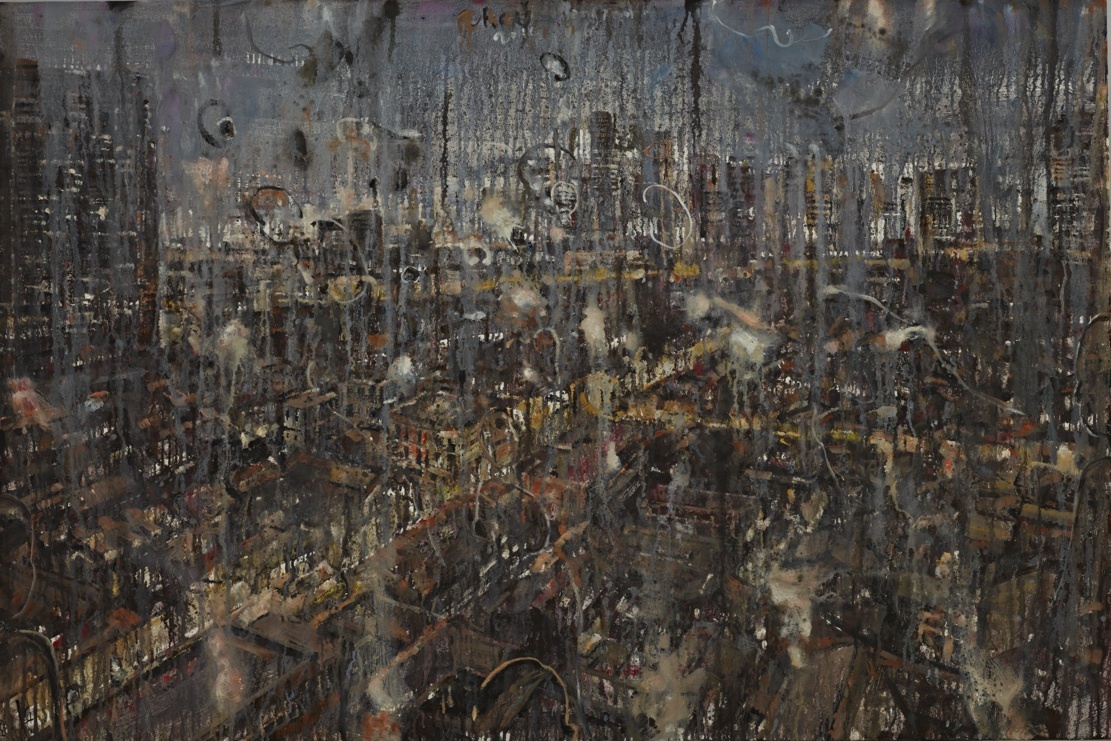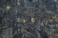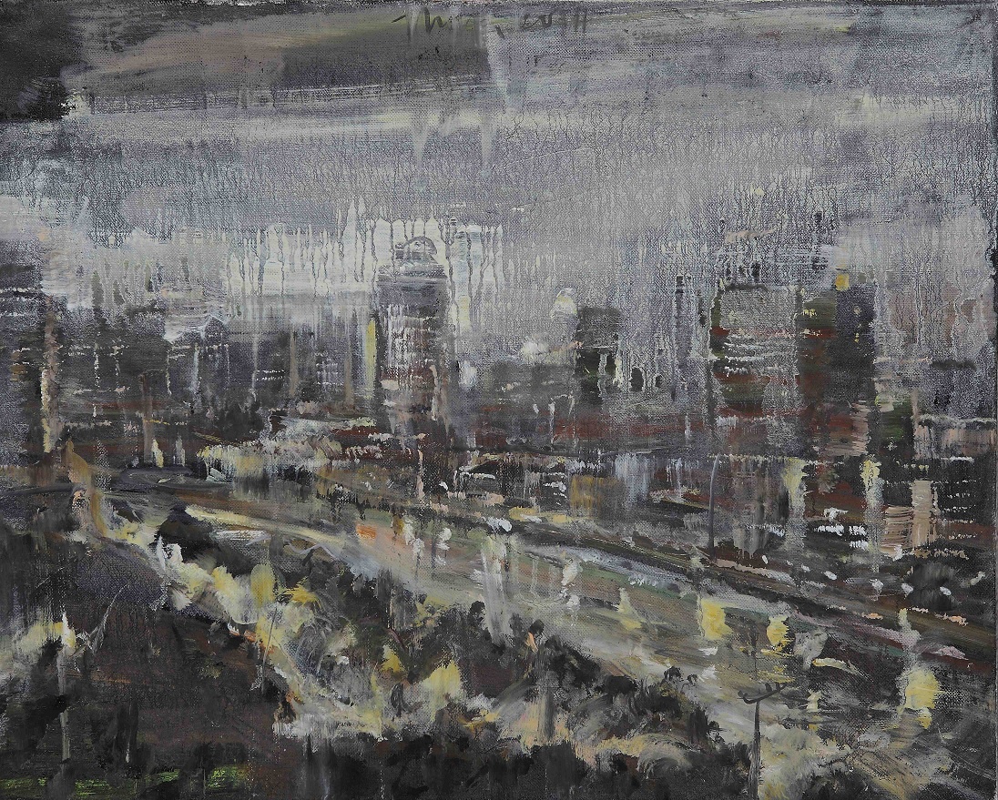 面对他的作品,迎面扑来的是生命流动的气流和气脉,它试图书写生命的历练和无奈,在黑暗中隐隐的发光。不断地涂抹,不断流淌的同时,它凝固为零碎的断片,生命的痕迹变得越加模糊起来了,越来越遥远。画面本身脱离了艺术家的控制,似乎自己不断的在生成自己,而我们只能跟随艺术家在这风景中寻找破碎的痕迹,让这都市风景不断的消耗着我们的生命,让我们变的无意义。我们离对象就这样渐行渐远,诚如贾克梅蒂说的:“我从鼻头到鼻翼之间看到的距离有撒哈拉大沙漠那么远” 。这种空间的无限推移使我们感知到的风景远离了我们,既远离了我们自己的身体,也远离了我们自己的内心。就这样,我们对自己心中的风景,越加地缺乏自信了,这些事物似乎曾经只存在过一次,但是现在,它们正消失的无影无踪。画中的每一笔、每一点、每一条线条,这些痕迹,又逐渐消失,脱离了意义而存在,成为不可见的风景。那可见的,那隐约可辩的风景——我们“眼中的都市”,那依稀能感觉到的记忆,早已不复存在!