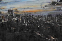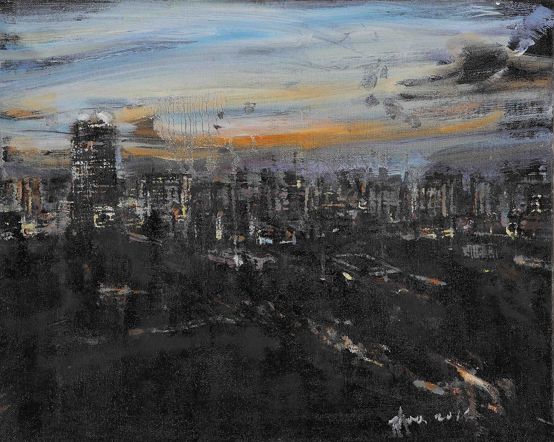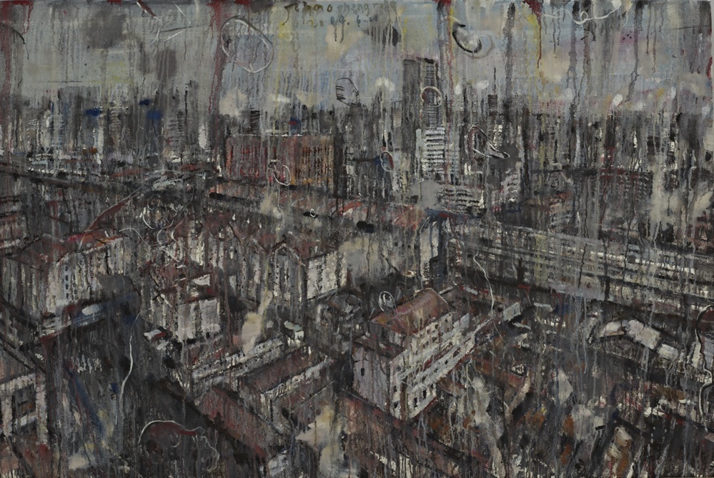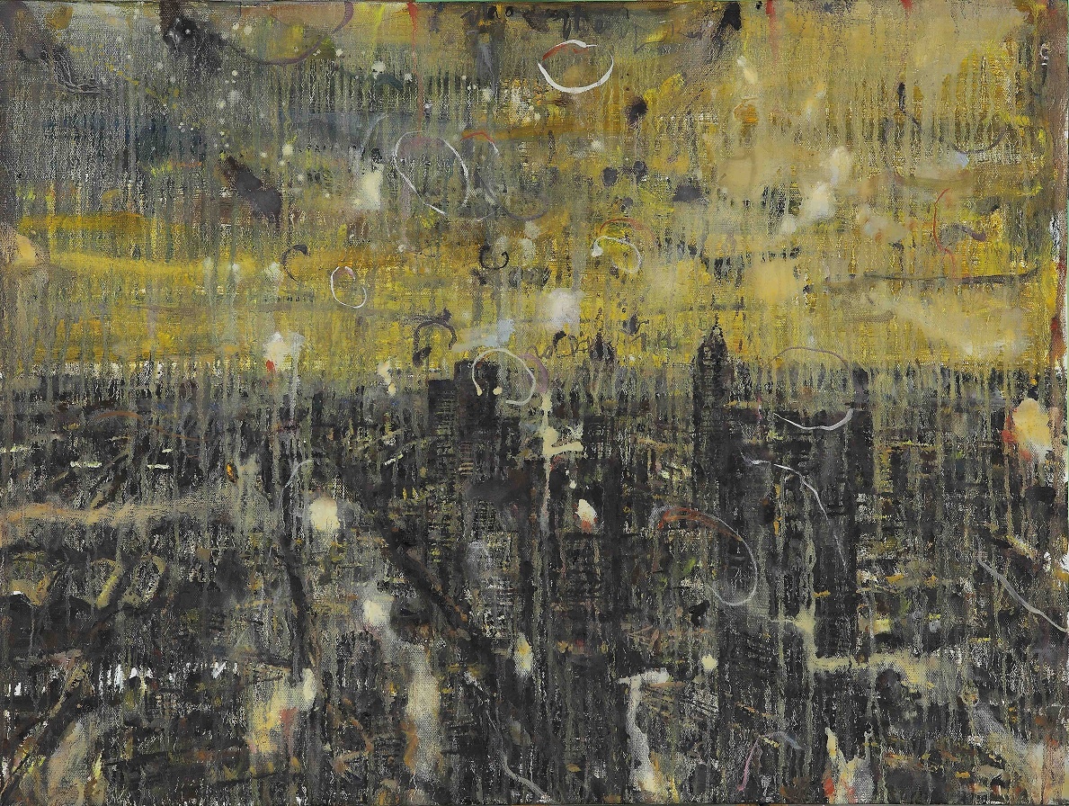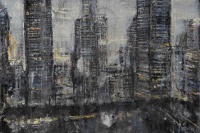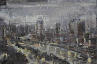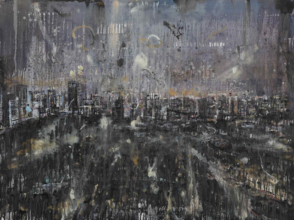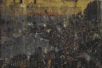 面对他的作品,迎面扑来的是生命流动的气流和气脉,它试图书写生命的历练和无奈,在黑暗中隐隐的发光。不断地涂抹,不断流淌的同时,它凝固为零碎的断片,生命的痕迹变得越加模糊起来了,越来越遥远。画面本身脱离了艺术家的控制,似乎自己不断的在生成自己,而我们只能跟随艺术家在这风景中寻找破碎的痕迹,让这都市风景不断的消耗着我们的生命,让我们变的无意义。我们离对象就这样渐行渐远,诚如贾克梅蒂说的:“我从鼻头到鼻翼之间看到的距离有撒哈拉大沙漠那么远” 。这种空间的无限推移使我们感知到的风景远离了我们,既远离了我们自己的身体,也远离了我们自己的内心。就这样,我们对自己心中的风景,越加地缺乏自信了,这些事物似乎曾经只存在过一次,但是现在,它们正消失的无影无踪。画中的每一笔、每一点、每一条线条,这些痕迹,又逐渐消失,脱离了意义而存在,成为不可见的风景。那可见的,那隐约可辩的风景——我们“眼中的都市”,那依稀能感觉到的记忆,早已不复存在!