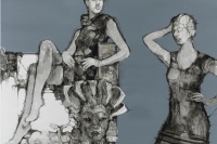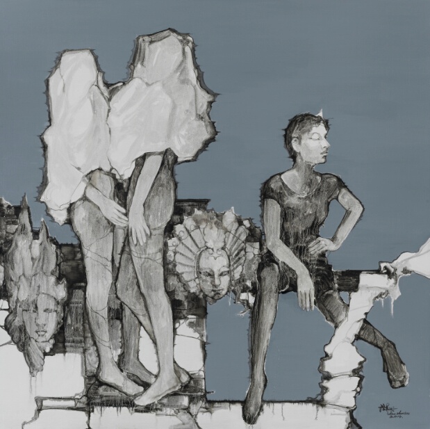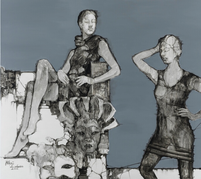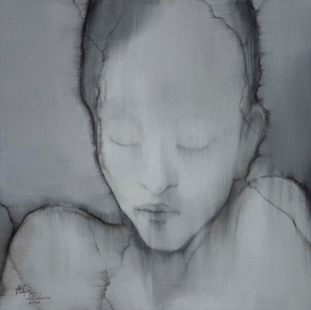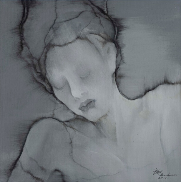 廖真武的作品在给人呈现地画面中的凄迷、恍惚、颓靡、虚无的意绪所包围,有一种春日午后浅梦初醒的怅然愁绪漫过全身,如同在宋词里冷不丁触碰到刺痛你的句子,无端地把你带到一种莫名其妙的空虚与伤感中。那一张张落寞惺忪暧昧模糊的青春女子的面孔,如水花镜月,荡漾着媚惑迷人虚幻清冷的波光,似乎触手可及,却遭遇冰冷而坚硬的现实阻隔,但你似乎又能隐约感受到来自画面人物丝丝缕缕梦呓般的气息。这些青春时尚幽灵般的女人,栖居在画布的深处,被无边的虚空所包裹,她们在属于自己的世界里冥想,看不出悲喜,却是如此的空灵与玄妙。