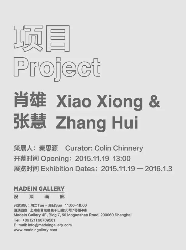 没顶画廊将于2015年11月19日推出由秦思源(Colin Chinnery)策划的展览《 项目 — 肖雄、张慧 》。