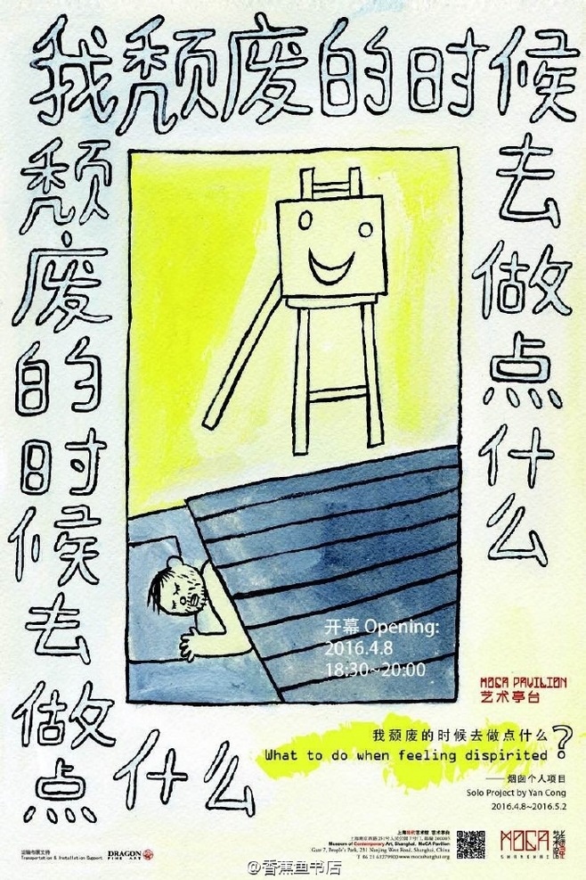 MoCA艺术亭台从去年便开始酝酿着,邀请烟囱来上海当代艺术馆艺术亭台进行一场项目,直到今年年初正式开始展开规划。烟囱说,艺术亭台的项目逼迫他要做点什么摆脱颓废。于是有了这样一个项目的名字:“我颓废的时候去做点什么”。这或许表现了烟囱近来的或长久以来的状态,埋头在小方格或画布之间,展开他的想象,或是把周遭有趣的片段刻画出来,却是一种将转瞬即逝的刹那反复琢磨的过程,在细枝末节之中煞费精力,只为保留那些可能让观者感到有趣的部分,想想都令人沮丧。