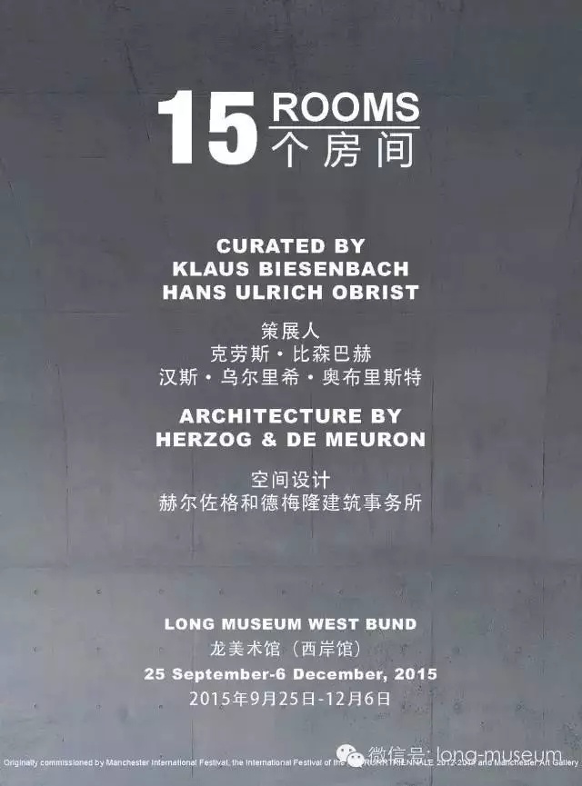 《15个房间》是一个重要的现场艺术展,由克劳斯•比森巴赫,MoMa PS1馆长,首席策展人和蛇形画廊联合总监汉斯•乌尔里希•奥布里斯特共同策展。这个展览由横跨三个时代和四个大陆的艺术家共同实现。在2015年的版本中,将比上一个在巴塞尔艺术博览会中展现的版本新增加一件作品,并将被呈现于由著名的“赫尔佐格和德梅隆建筑事务所”设计的建筑空间中。