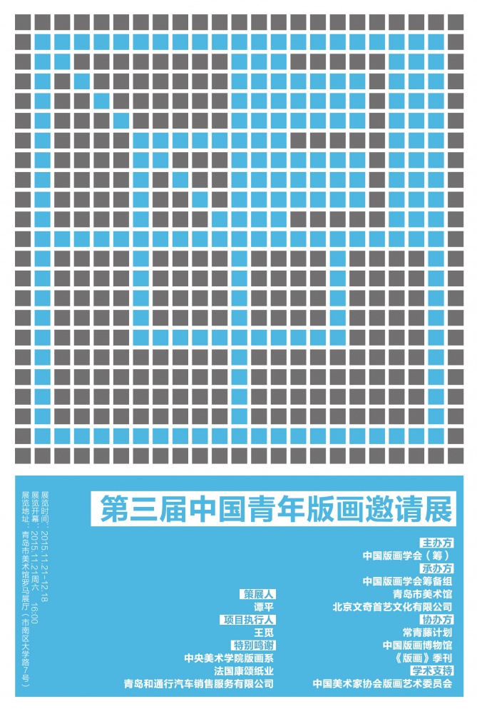 中国青年版画邀请展肇始于2011中国版画年,为了保证展览的学术指向,组委会特别邀请了著名艺术家谭平先生连续三届担任策展人。经过前两届的历练,中国青年版画邀请展已经成为国内最为重要的青年版画推广平台。2015年第三届中国青年版画邀请展将于11月21日在青岛市美术馆举办,之后将会在深圳中国版画博物馆、黑龙江省美术馆等多个美术馆进行巡展。本次展览得到了国家发改委文化产业研究所,中国美协版画艺委会、中国版画学会筹备组、中国版画博物馆、中央美院版画系、常青藤计划、北京文奇首艺文化有限公司、以及法国康颂纸业、青岛和通行汽车销售服务有限公司的大力支持。