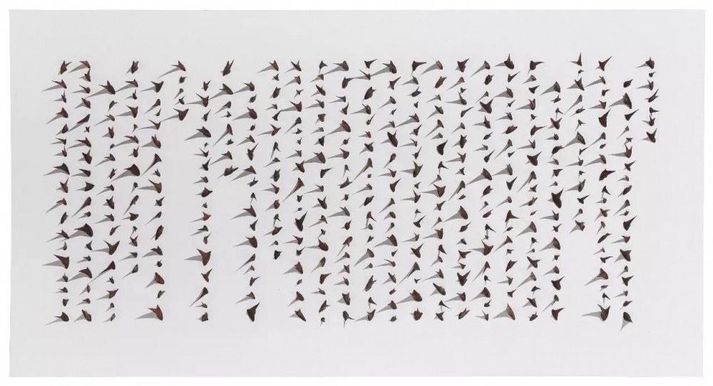 在“自然的手稿”系列中,干枯的葡萄藤枝被纵向排列犹如中国草书一般,崔斐根据这一主题创作了一系列不同的作品。此次展览作品“自然的手稿Ⅴ”,除了装裱在画框中之外,还有被直接钉在墙面上的装置,而作品的尺寸则根据展厅空间的大小比例来决定。