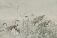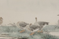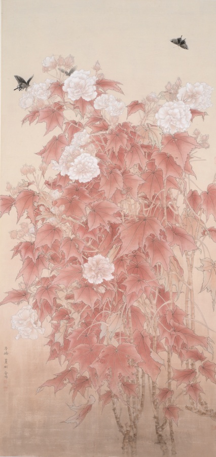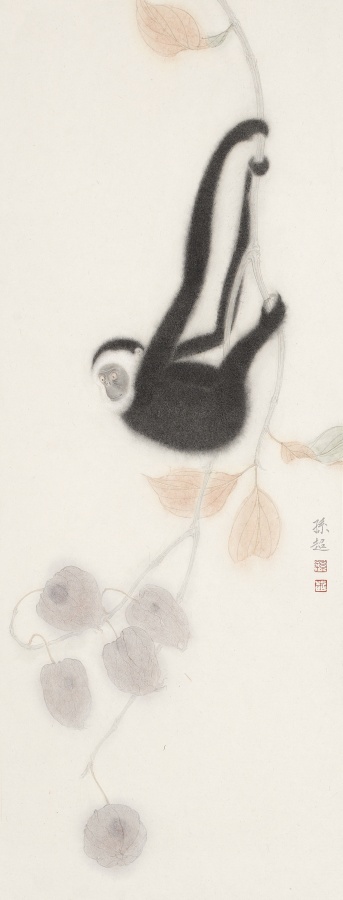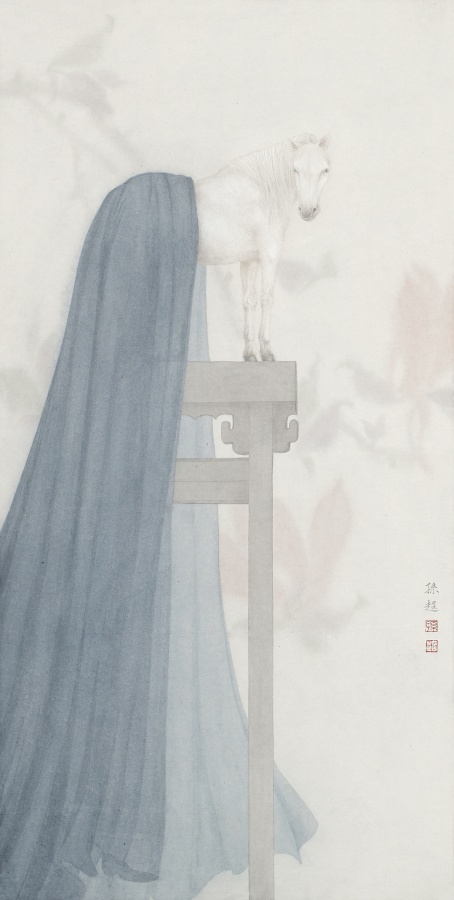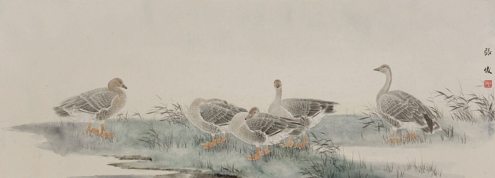 张俊、孙文龙、李娇、孙超四位花鸟画家的创作,都在是追求一种“工笔画的写意性”,这种“写意性”不仅仅体现在语言形式上的直接表现,诸如汲取“没骨法”的影响以淡墨晕染出枝叶的形态,还体现在对于中国传统绘画“写意情怀”的直觉感悟:在一种极为繁复的绘画程序中体验笔墨触及宣纸时的微妙和欣喜。抑或者说,这种写意性存在于一种操演笔墨的状态之中,当四位花鸟画家专心致志于绘画中时,这些“写意性”就已经成为一种“行为的过程”,也就是“时间的形状”。“绘画”也就成为创作者参悟生命至理的一种“行为方式”,在最为理性的控制之外却是一种“淡然”的心迹,这些都在画面中具体的一笔一墨之间得以体现,也在画面所营造的空间和意境之中显现出对“写意性”的感知。“写意性”必然是一种内在于绘画品性之中的“精神”和“格调”,相较于外在语言形式的视觉表征,其更为注重一种内向性的语义结构:“写意性”是一种“感觉”而不是“视觉”。
