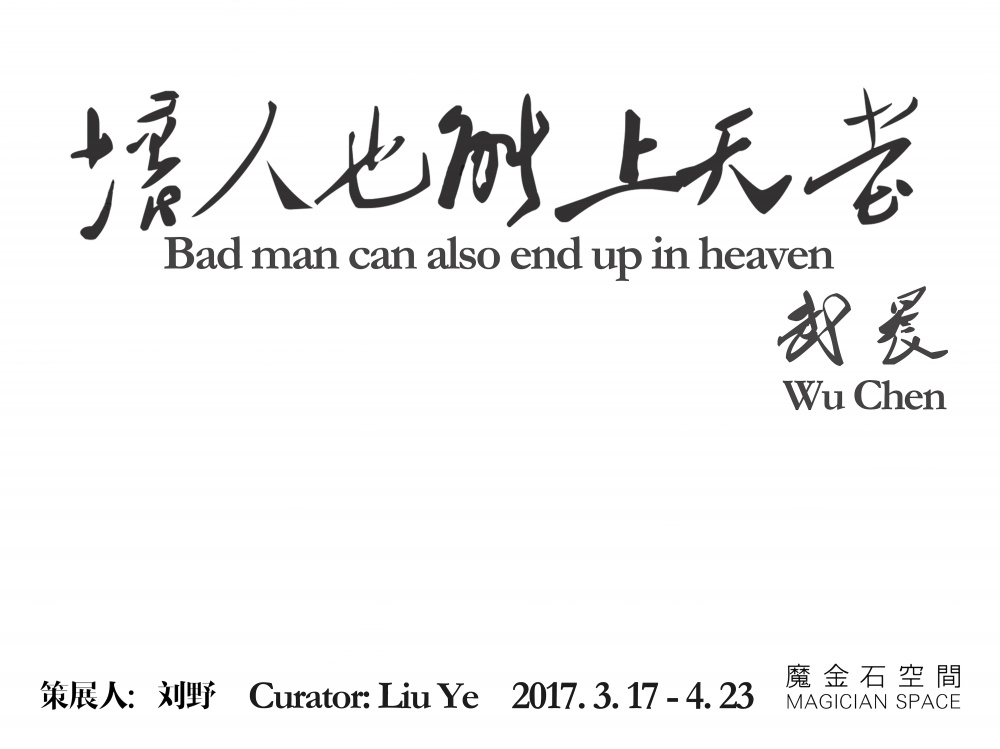 “坏人也能上天堂”是这次展览的标题,它并不意味着“好人就要下地狱”。标题的字体用的是毛泽东的草书,其中第一个字 “坏”和最后一个字“堂”都不好辨认,不要紧,可以只读成“人也能上天”。