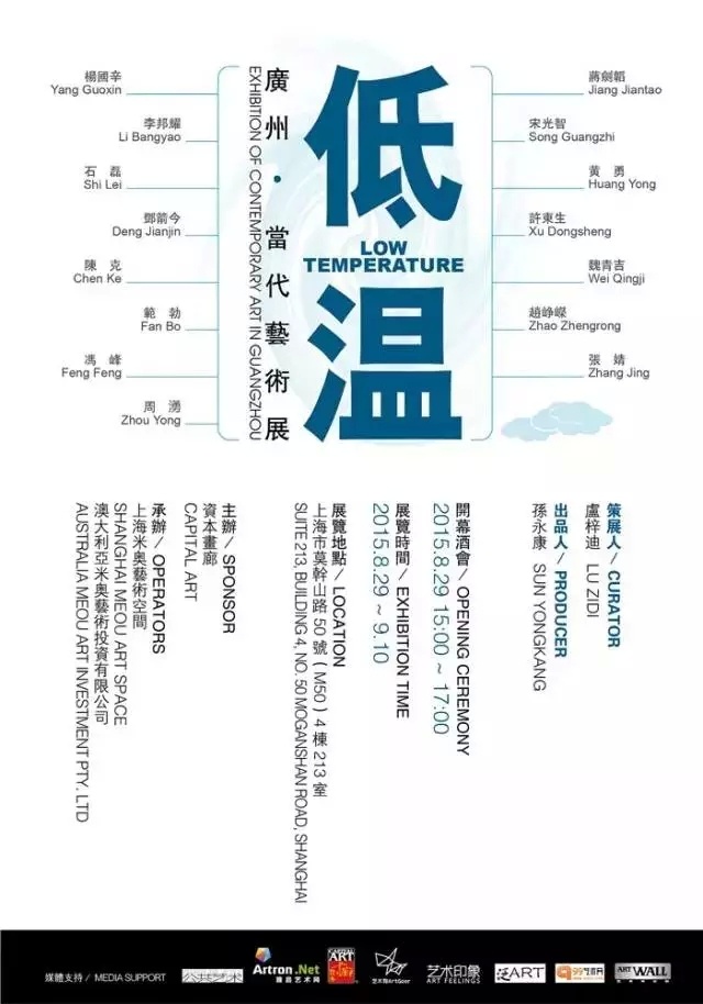 2015年8月29日至9月10日,低温——广州当代艺术展在上海M50米奥艺术空间举行。此次展览由卢梓迪女士策展,展览邀请了杨国辛、李邦耀、石磊、邓箭今、陈克、范勃、冯峰、周湧、蒋剑韬、黄勇、宋光智、许东生、魏青吉、赵峥嵘、张婧十五位艺术家参加,旨在展示广州当代艺术的原生态和多元化的艺术创作。