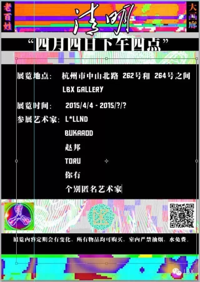 4月4日下午4点LBX gallery第二个展览《清明四月四日四点》将开幕,这天大家可以早点过来。我们有了更多的凳子桌子,BTC食物小组会提供高品质的鲜美街头食物组合,首份公布的食物菜单将主打街头风,将欧美快餐的精华加入地道的中华美食中,特选多款重口味啤酒配合选择。