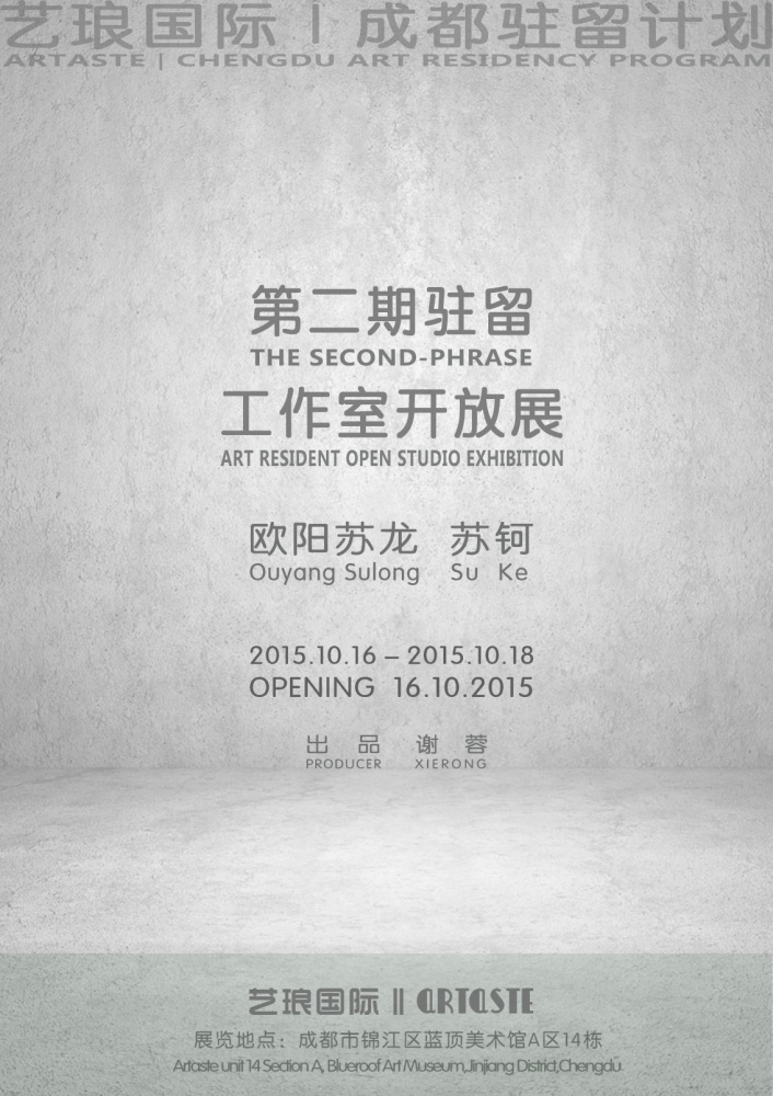 艺琅国际第二期驻留展将于2015年10月16日在成都艺琅国际隆重开幕。本次展览将展出第二期驻留艺术家欧阳苏龙、苏钶于8月25日至10月10一个半月驻留期间内创作的作品。此次展览有装置作品及影像作品。