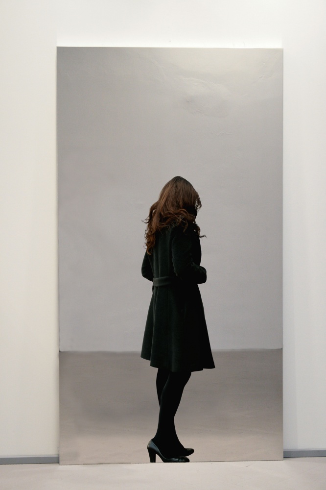 在Pistoletto的创作之中,镜子成就了他的想象和突破,令艺术在社会脉络中能展现更多面向的性质与作用。而人像亦成为他研究的基调,探讨「存在」的客观身份与日常生活不断变化中的精神需求。人物从侧面与背面的呈现,彷如间接地向镜子中深处的我们招手。作品在叙事的情节上,暗示出孤寂与人性的脆弱,反映出永恒变幻的现实、时间与日常生活影响着每个人。是次展览的独特之处在于作品展示出同一位人物,重复地出现于环形的展示空间中。画中的女性带抽离的身体语言与沉思的举止,时而背向我们,时而面向我们在镜中的影像,有时像要步出画框之外进入旁侧的空白之中。Pistoletto透过作品把玩着不同的观点与认同感,让观者从中反思个人身份,主动作出自省及响应。