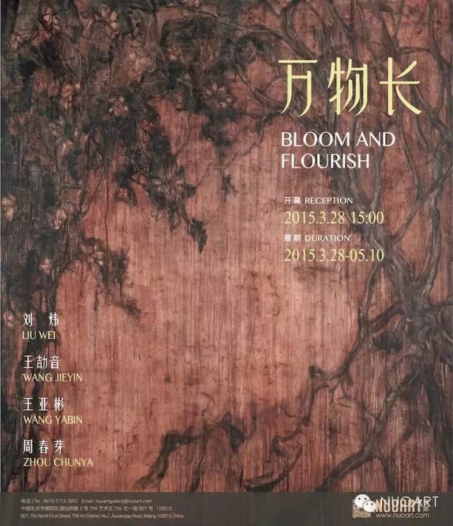 NUOART画廊2015年首个展览项目《万物长》将于3月28日开幕和呈现,展期至5月10日。本次展览将展出四位在艺术界以独到风格及文人气质闻名的艺术家作品,包括刘炜、王劼音、王亚彬、周春芽。即将呈现的作品创作时间跨度将近20年,从画面上看,皆是有关风景,花卉的绘画作品,而背后呈现的则是具有中国时代特征的“精神风景”内涵。