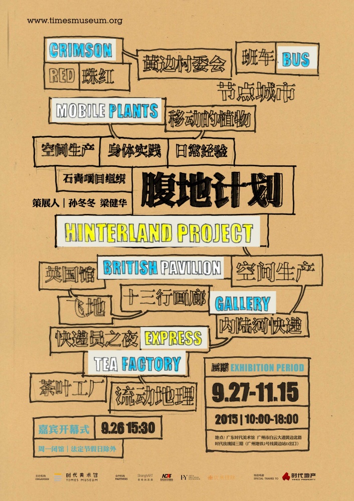 “腹地计划”,不同于一般的美术馆个展,它将空间生产视为今天艺术的迫切任务,由艺术家石青策划、组织,并与其他艺术家协作完成,是一个包括了十余个子项目的集合体。“腹地”援引自地理学的概念,在此引申为一种与全球化形成对话关系的在地性。在“腹地计划”中,“班车”、“内陆河快递”等项目在中国的七个节点城市(地方)展开,与展厅内的其他项目共同构建起一整套现有艺术机制的逻辑结构:从展示到驻留,从画廊系统到公共艺术制度,以实践化的方式进行混杂,在一种多边的、复杂的、网络化的地理关系中,重新推演当代艺术生产在中国的可能性;“英国馆”是一个关于全球化食谱的未完成排演;“快递员之夜”则关注世界工厂的日常空间;“茶叶工厂”尝试在工作中建立对话……空间作为差异,作为联系,作为生产关系,是社会生产和再生产的现场,也是唤起个体主体性的媒介。因此,“腹地计划”展现的并不是保守性的地方主义,更不是所谓的艺术介入社会,恰恰相反,它是一次将社会引入艺术的行动,在一个临时的公共领域中,尝试制造出一个成为共同性的时机。