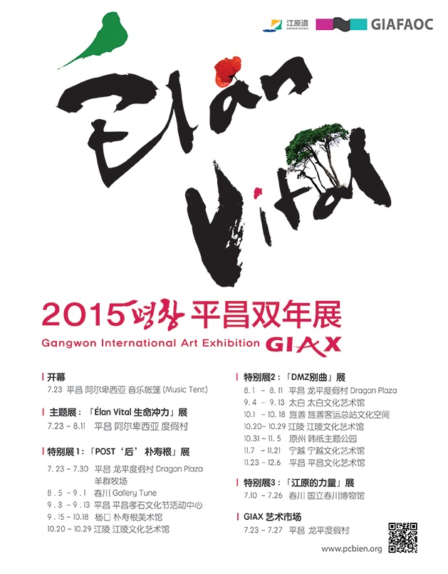 作为2018年平昌冬季奥运会的主要文化项目之一,“2015平昌双年展”是联接艺术与体育的桥梁,将其提升为文化奥运会,并使江源文化开始走向世界。自2013年首届双年展举办以来, 以“生命冲力”为主题的第二届平昌双年展将于7月23日下午2点在江原道平昌阿尔卑斯开幕。此届2015平昌双年展的总策展人为李在彦,分别在中国、日本、法国活动的赵慧玎、Matsunaga Ko、申贤淑等人共同参与了此次双年展的策划。