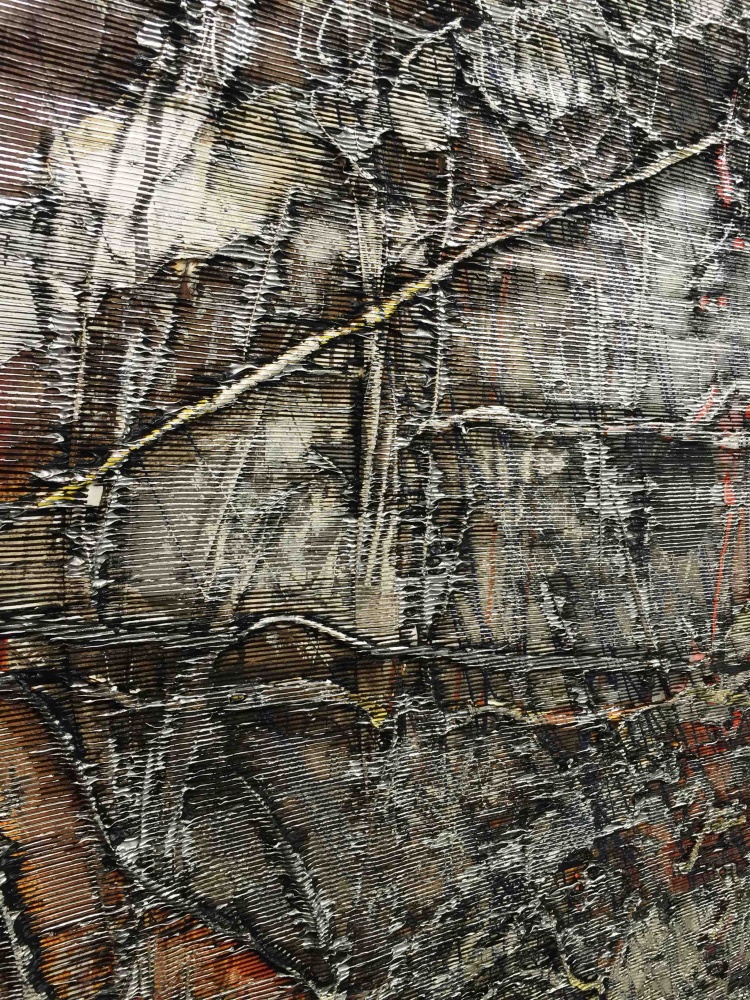是次展览呈献的一系列最新作品,Weiser 沿袭其一贯对动态进程中多元美学技巧的运用,保持自发和非自觉间的持续相互作用。密集金属感轮廓及无尽划界的强烈对比,在解构和重建的更迭中挑战形式的限制。艺术家绘画时变化的技法和速度体现出一种时间感,在画布表面堆积或抹去厚涂的颜料,创造富有独特光泽的抽象局部。被抹除的画作表面之下,被损毁的部分展示着潜藏的层次。极富力量的五幅画作令人惊艳,细节触感丰富,透过色彩、比重、视觉节奏和密度的变化完美演绎。厚涂颜料切出繁复的壁垒和俯冲记号;闪烁的颜料自拙朴的颜色及倾斜、疤痕般的线条跃然画布。将表现主义行为当作一种调解,Weiser 的作品显得同时动荡不安又十分精准,与反对论断的正面描绘相呼应。