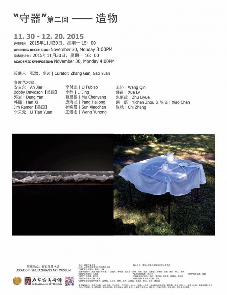 “守器”项目第二回——“造物”由石家庄市美术馆、清华大学美术学院当代艺术研究所联合主办、北京百思慧灵文化传播有限公司出品。展览将于2015年11月30日下午15:00于石家庄美术馆开幕。展览特别邀请清华大学美术学院副院长张敢先生作为学术主持,并与中央美术学院美术史论博士高远先生共同担任联合策展人,同时此次展览研讨嘉宾包括吕品田、尚辉、王端廷、郑工、邵亮、唐廷强几位专家参加开幕当天的学术研讨会。