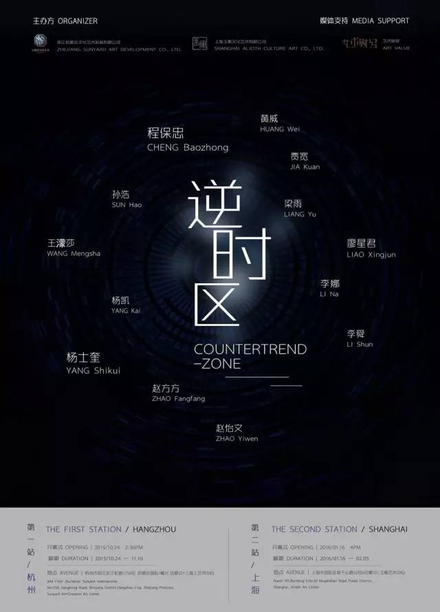 作为此次合作机构推出的首个艺术项目,“逆时区”旨将通过推选十二位以上艺术家及其在该主题意义下的参展作品,举办每年一次的展览活动,向观众传达在当代领域内艺术家创作理念与方向。此次展览,计划将分别先后于杭州、上海两地展出。我们将在共同主题下,配合各地空间特征来分别呈现多位艺术家的作品,带给观众不一样的视觉体验。同时,“逆时区”作为一个具有延续性、发掘意义的艺术项目,我们也将后续与更多不同地域的艺术机构、媒体合作,推出一系列具有共同内涵又赋予时代特点的青年展览项目,通过设计品牌LOGO,开发参展艺术家作品衍生品等,尝试更多途径推广艺术家与作品。