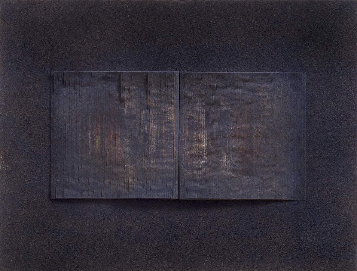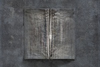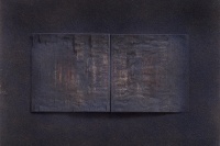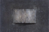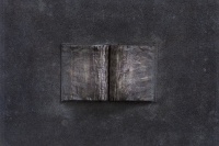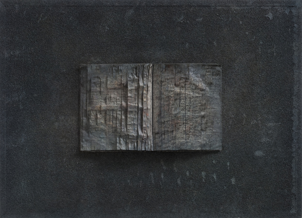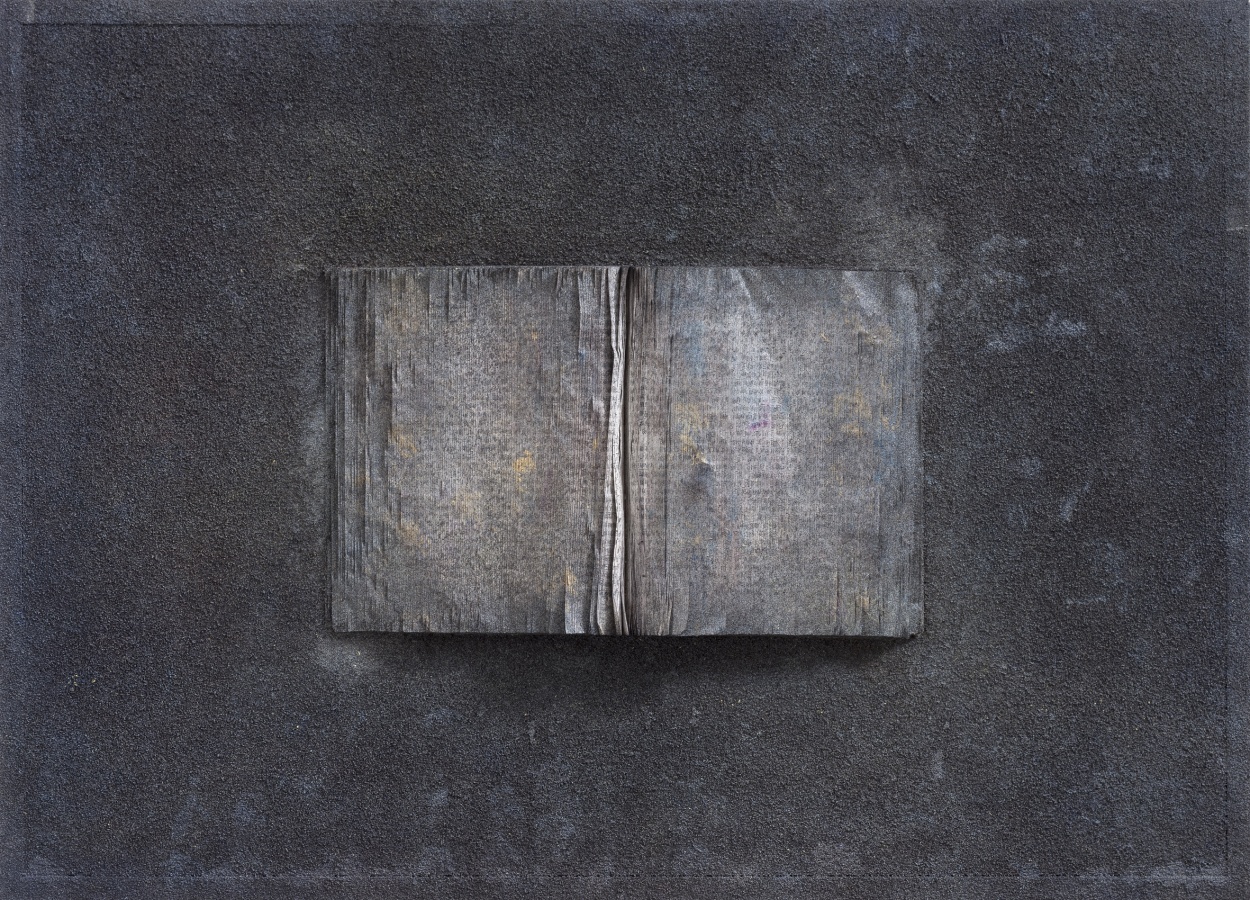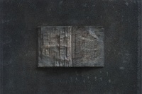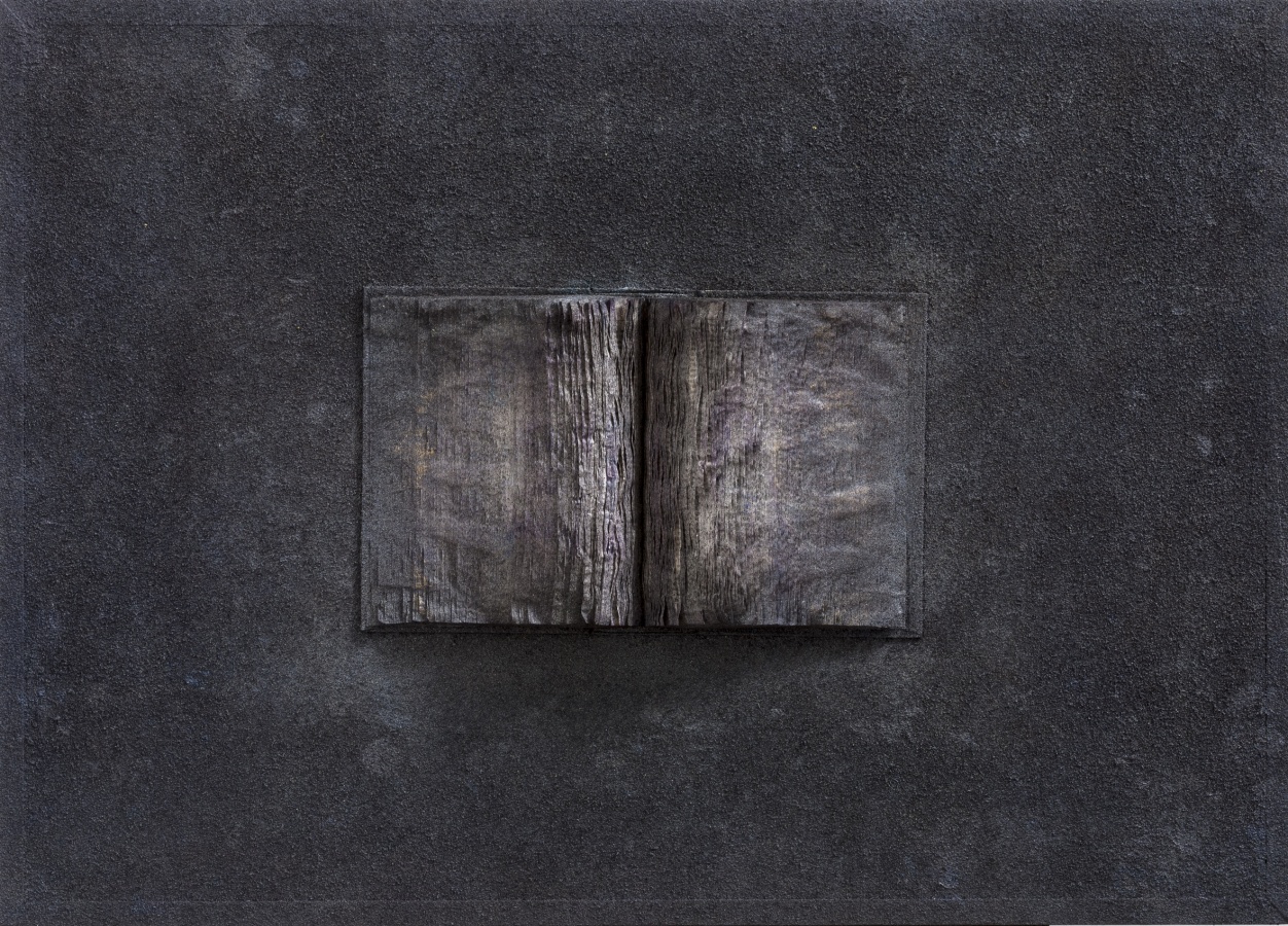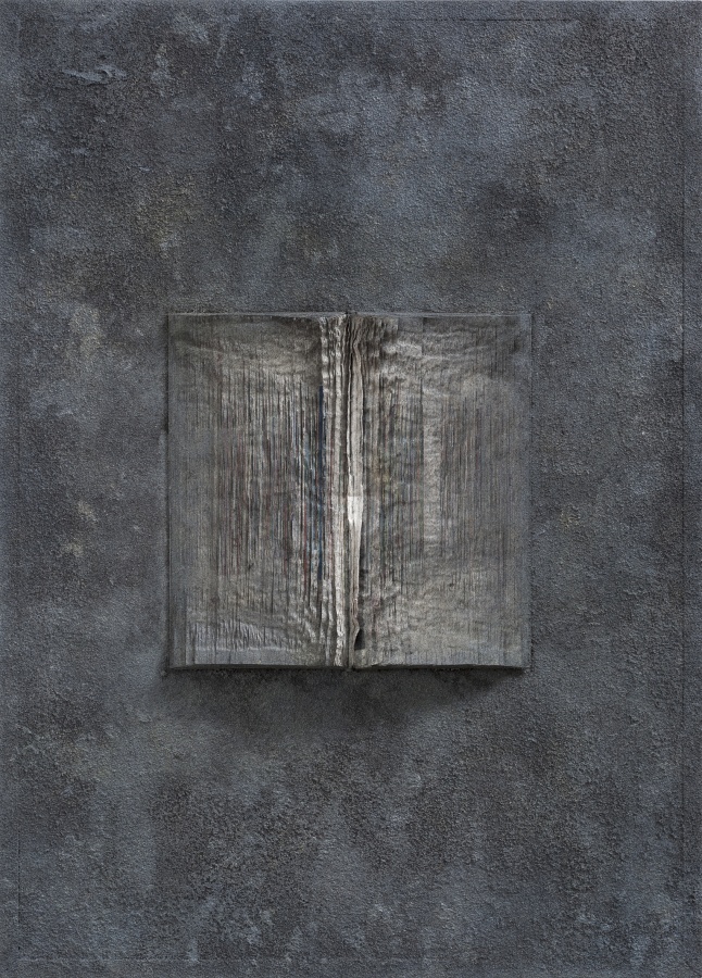 第二批作品:则集中于单册书本上,打开书册,看似展读,但经过反复种色之后,新的色泽与之前切碎的杂色一道,在浓重玄暗的基本色调中,打开的书册又似乎被颜色封存起来,看似一个个小小的纪念碑,或如同堆积起来的碑文与碑帖,或者就是一块碑石,这是书之废墟,带有历史的苍茫感,如同无尽的铭文,如同魂魄萦绕的残骸物。