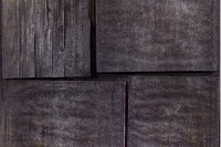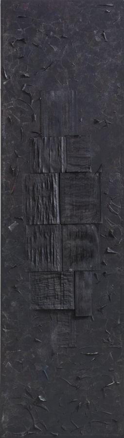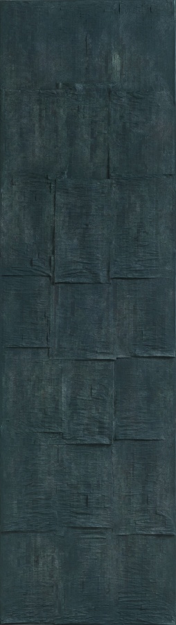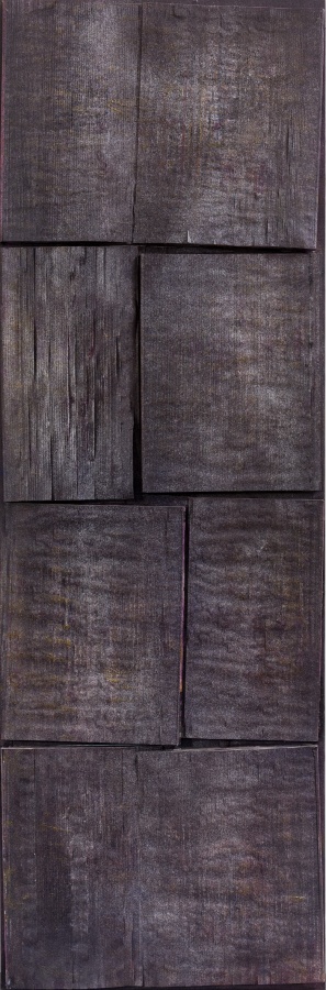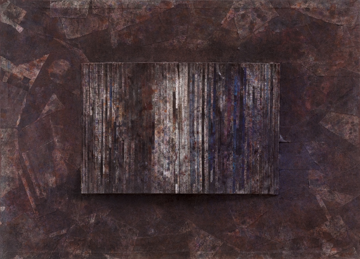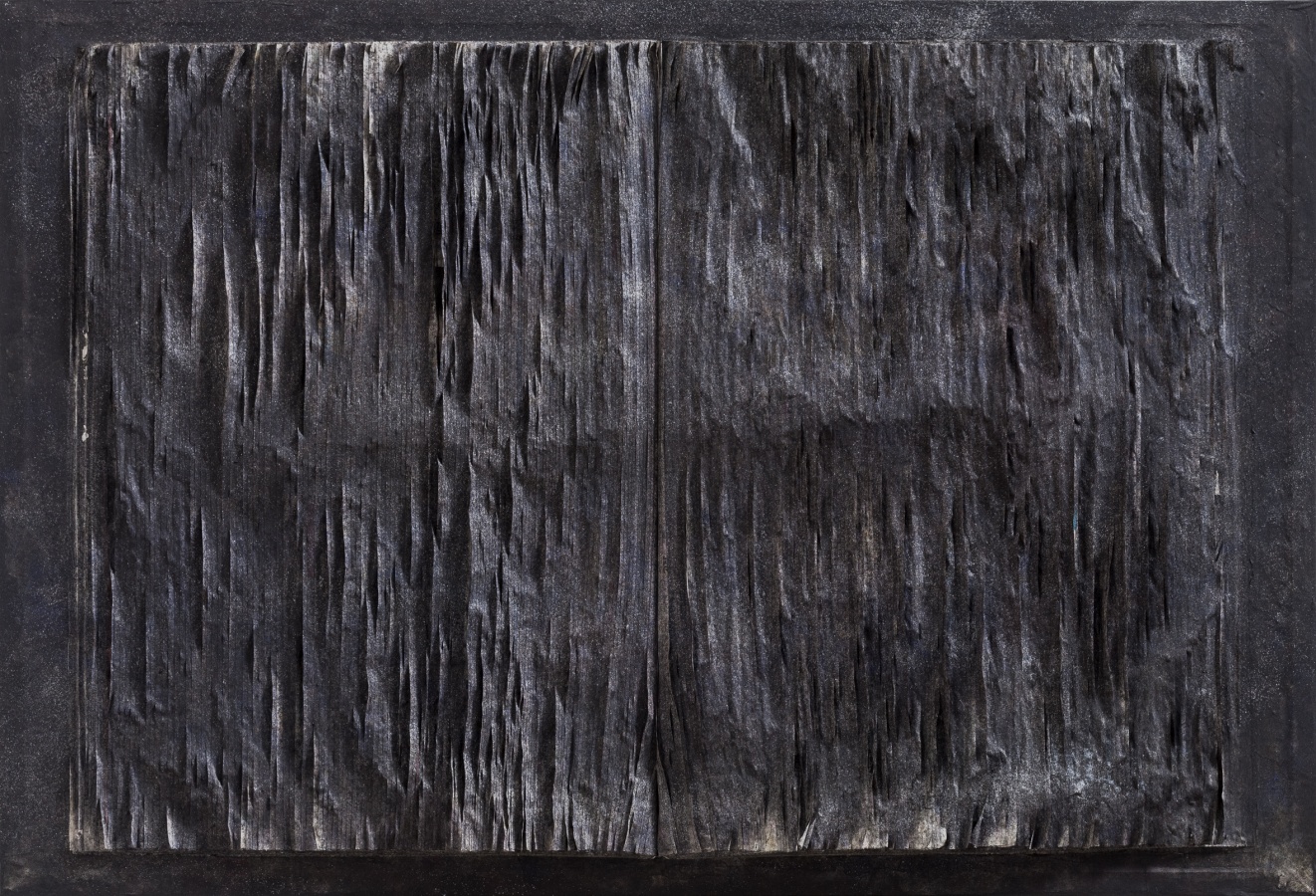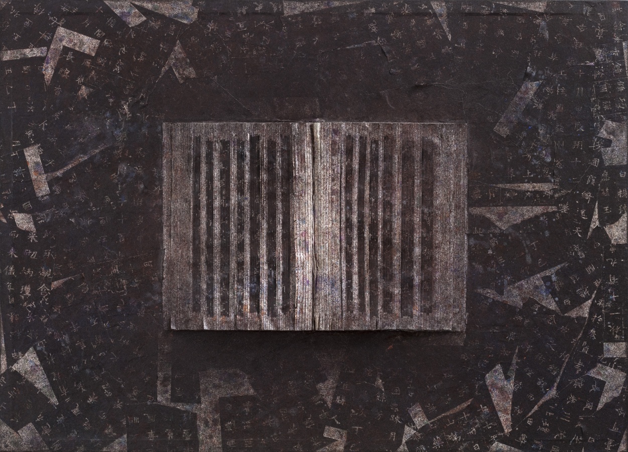 回到图册与书册,画书也突出了书本的文本性,突出文本的质地与表面的触觉肌理,余留了文字,也是文书,但都生成为纹理或者肌理,也保留了文气,只是这文气经过了现代性的转变与切割,生成为竖线的抽象线痕,或者是块面状,与西方的结构抽象对话,如同几何形块面,也有着行动抽象的切割裁切动作,但在着色的玄暗处理后,更为不可见。这是对书册的重新打开,是书之重生。