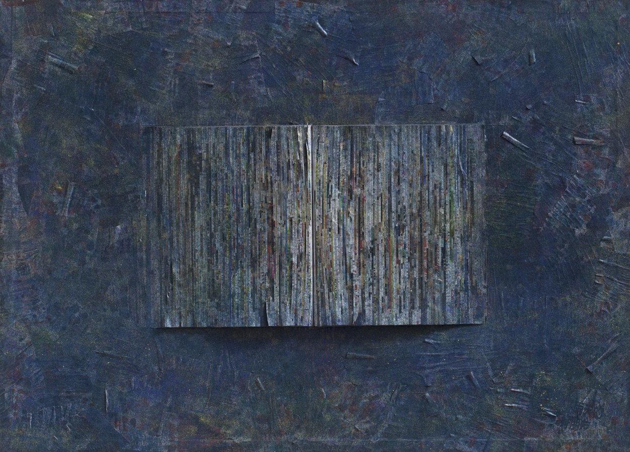 一方面,现成品的绘画化:这些裁切与上色之后的作品,因为书册的厚度,看似“准雕塑”,有着浅浮雕的触感,因为这真的就是一本书,一本书册,而书本乃“物品”,在切割后,去掉了实质的信息内容,仅仅留下斜切的线纹形式,形成抽象画一般的肌理,看似某种材质的肌理化抽象。但又是“互文性的”,回到了书本与文本,平面基底上还有着碎纸叠加黏贴的文字。郁涛让书册直接进入作品,不是传统绘画对物象的参照与描绘,而是直接把物置于画面上,但又不是画出来的,而是把“物”直接置于平面上,让现存实物直接显现,但又经过了精心地时间化处理。