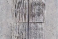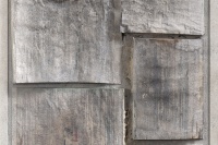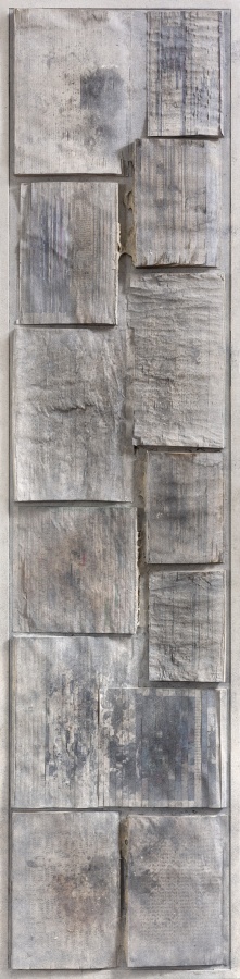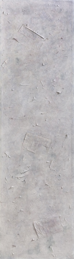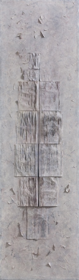第四批作品:则更为混搭,贴书与贴纸,对肌理更为自然性地利用,细碎与厚实并存,形成对比。更为散碎,与凝结对比。更为具有作品的张力,在现代性的散碎与坚实之间,在痕迹的抹去与余留之间,在可读与不可读之间,形成了张力。