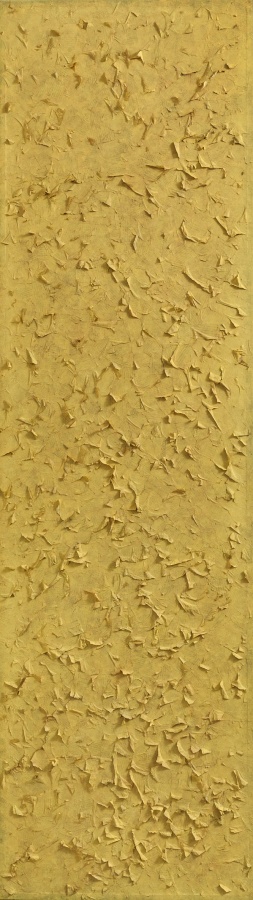现在,我们有了郁涛的现成品绘画,那郁涛如何做的呢?他有着他自己的方式,他裁切收集的书册、画册与系列报纸,等等这些“物品”,通过反复的种色,筛色,使之呈现为看似材质式的抽象作品,又看似装置性的绘画作品,其中的混杂与复杂,让我们看到了现成品绘画的新样式。