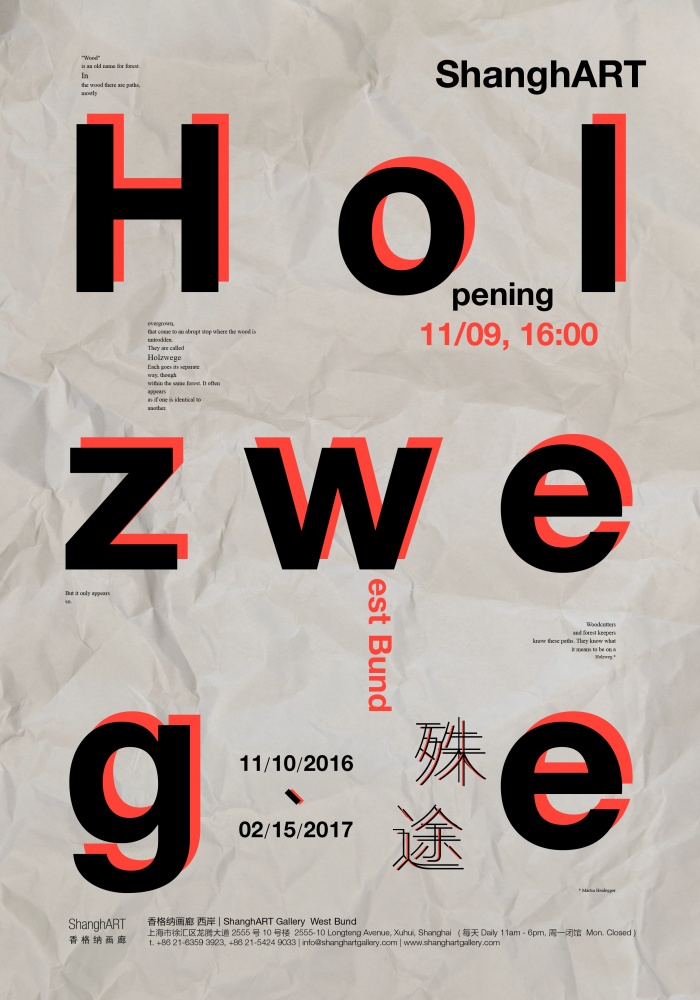 香格纳画廊二十周年特展《殊途》将于2016年11月9日在香格纳西岸新空间举行。该展览由徐震和施勇联合策展,以德国哲学家海德格尔的著作《林中路》为出发点,呈现二十余名国内外艺术家在不同时期探索下的代表性作品。展览持续至2017年2月15日。