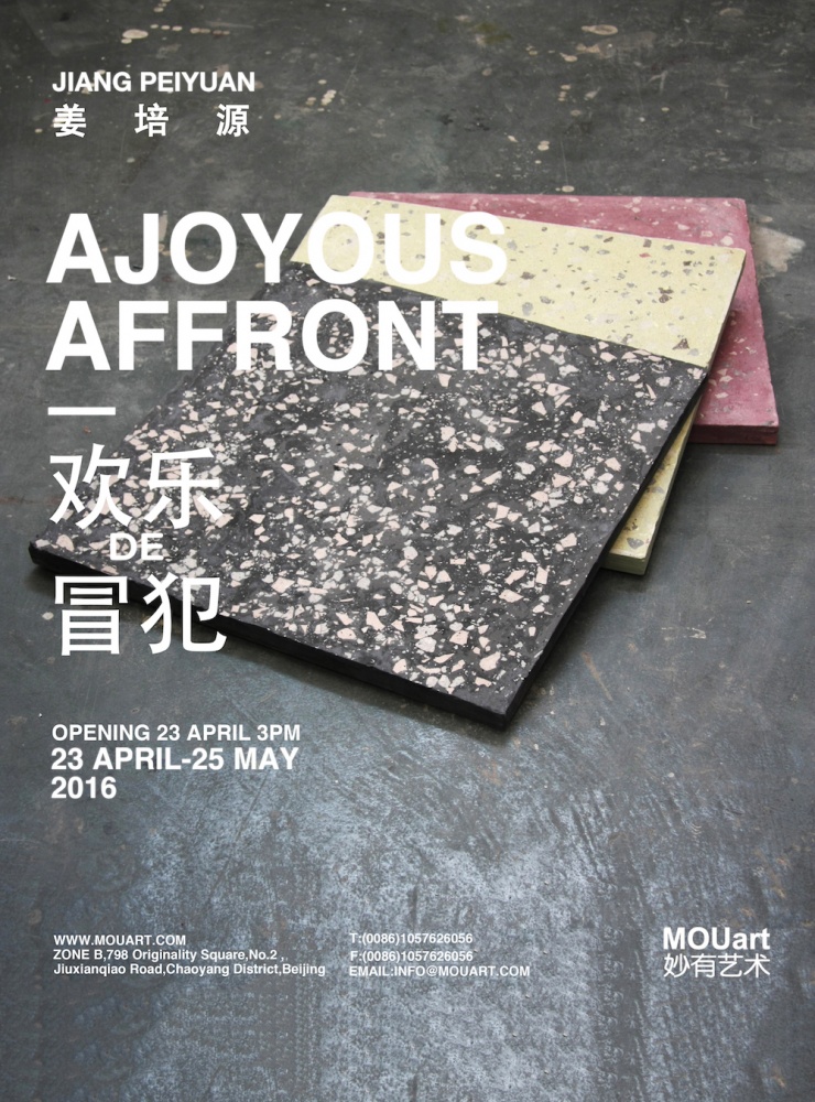 《三块水磨石》作品直接借鉴了建筑施工预制水磨石的制作工艺,把丙烯颜料及水泥粘合剂预制的色块打碎,进而加工打磨成地板砖。