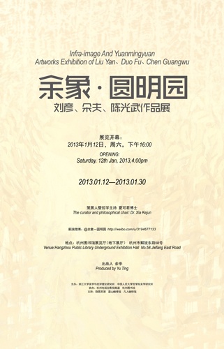 参加这次展览的三位艺术家都是最早一批在北京圆明园艺术村驻扎的艺术家,但他们一直是边缘人,也一直是多余人,有着对剩余与多余之丰富的生命经验。随着中国当下艺术遇到它最为内在的危机,要求我们重新回到当代艺术的起点,回到圆明园精神,这是重新的起航!这三位艺术家的作品最好地体现了中国当代艺术新的可能性与艺术的潜在精神力量,三者都体现出一种文化生命转化的“余象”形式:刘彦以其对儿时乡村的记忆,以“余存者”回眸的惊恐之眼打量这个日益失去诗意的世界,却余留了艺术内在的文学性与拯救的力量;朵夫十字形复写的基督性艺术,既是对基督教倾空神学的中国式书写,也是主体的退让而为艺术给出更多地“余地”,也是对中国生命气息书写的换气,给悟性的艺术带入了灵性;陈光武的“阴阳书法“对空白的多重书写,以当代的方式重构了水墨书写的原理,解决了波洛克以来无笔的困境,重新结合了有笔的“工夫”书写与无笔的“余让”姿态。这三位艺术家的作品,将为我们打开中国当代艺术之新思考的可能空间。