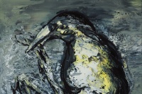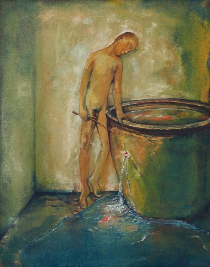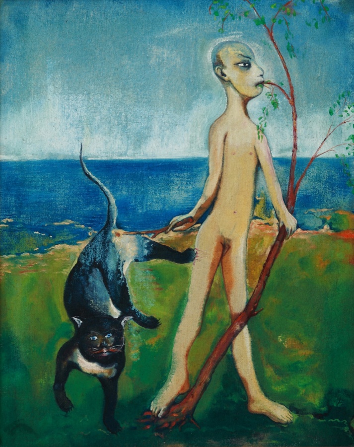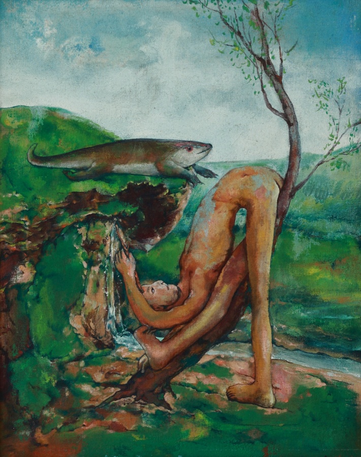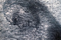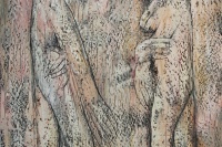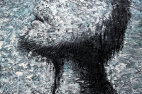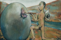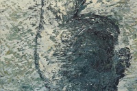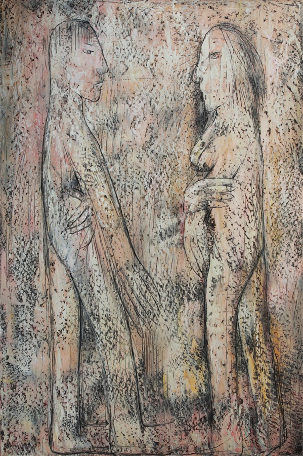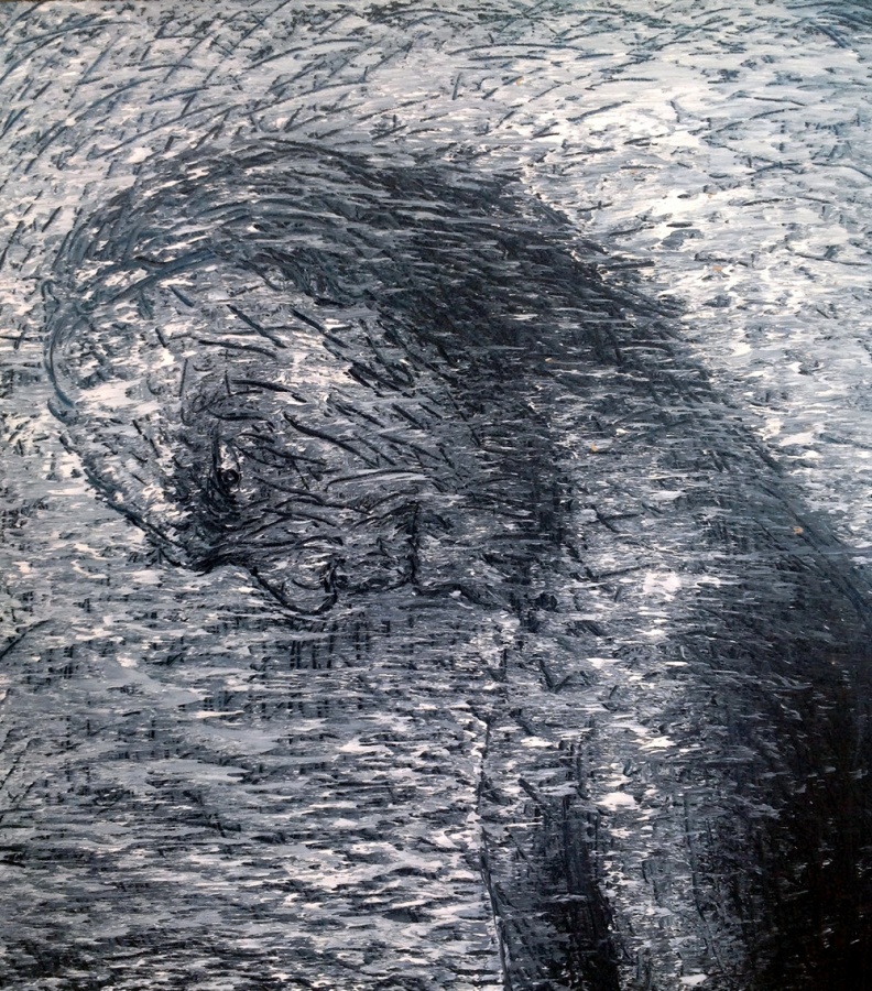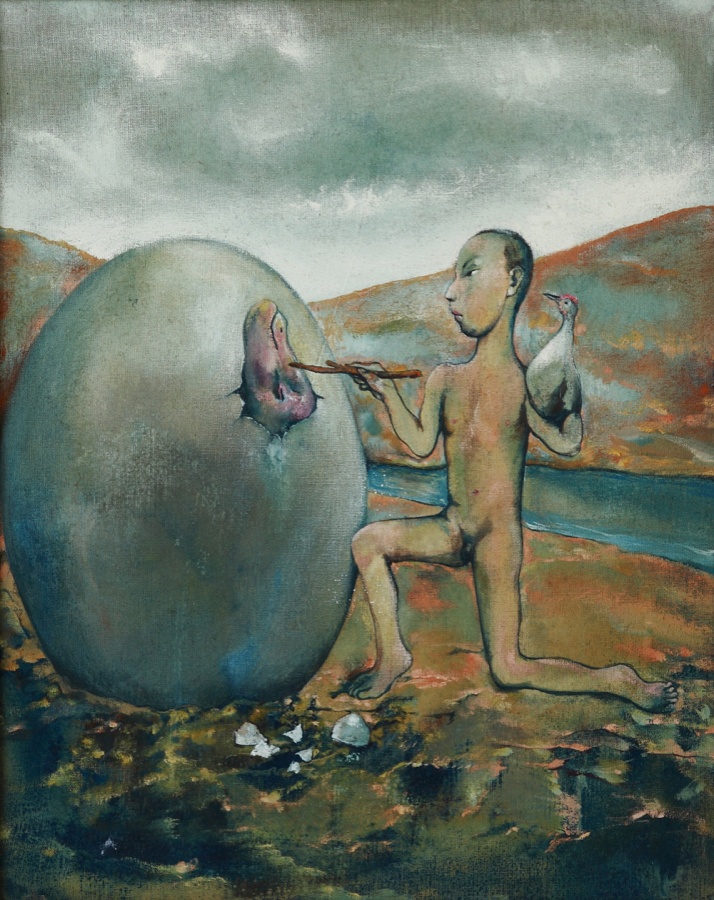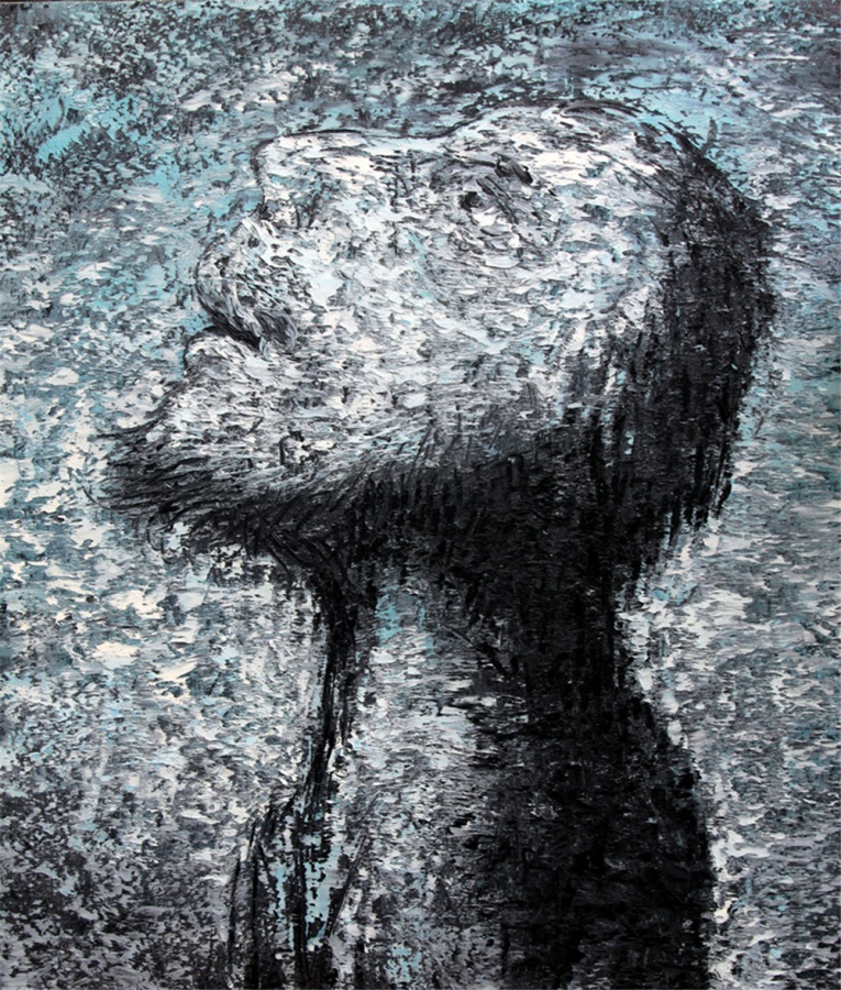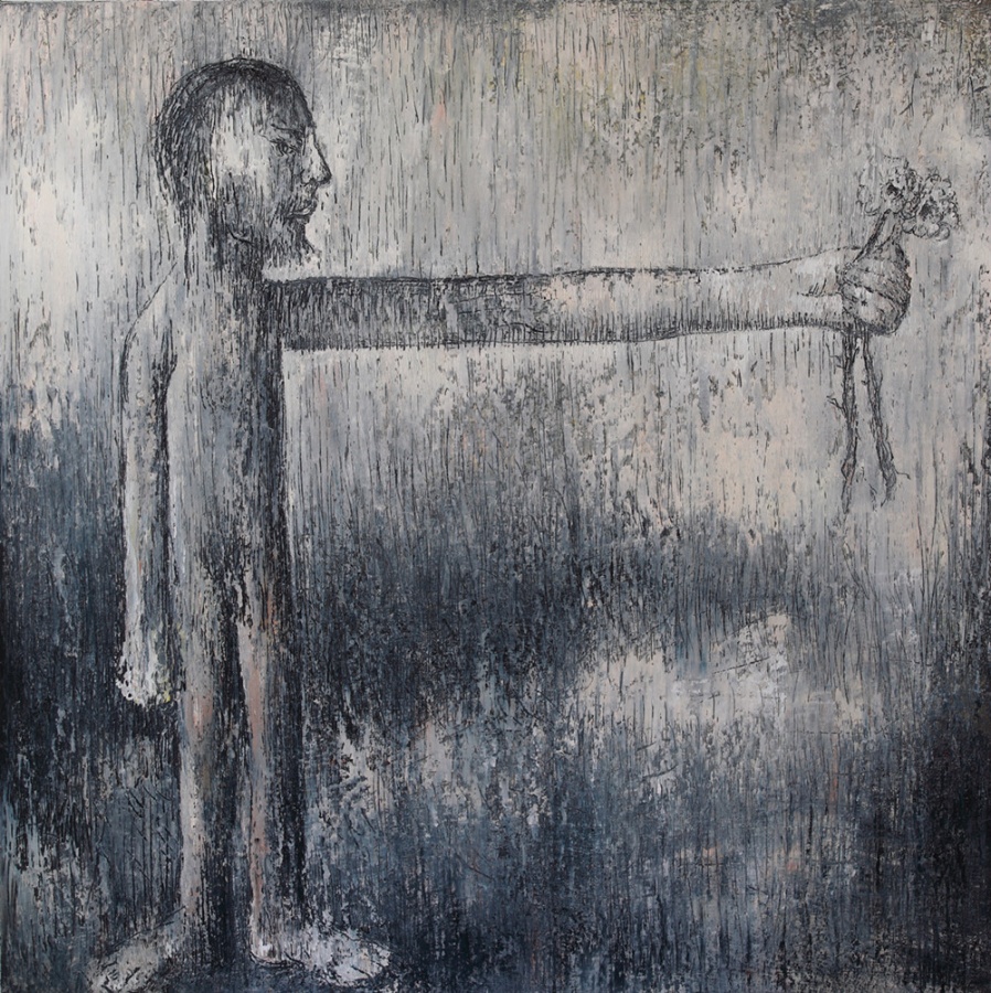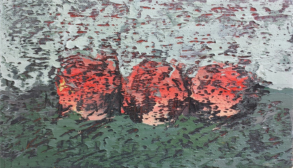 这次展览作品大致分三个部分,一部分为早期少年人物篇,色彩、造型、场域都意趣盎然,邻家顽皮少年初长成的感觉,迷漫着自我沉醉的隐性诗意。第二部分主要为山,艺术家主要关心地平线,颜色如浆,视之辽远,近之可触。此系列从形式到语言最接近于圬人。看似简单,实则不易,得之于近,取之于远,艺术家需来回反复,方能让远近融为一体,存在又虚无。亦如古人所言,"看山是山,看山不是山,看山还是山",这是对造物的领悟亦是对道的证悟。此道艺术家历练已久,曾经从北京徒步至临湘,又从大理至拉萨,历时五个多月途经四千余公里,中途不使用其它交通工具。徒步,就是用脚来丈量,用自己的肉身体量大地。第三个系列,我戏称为甜蜜爱情系列。大胡子的男生,面庞如刚从荒原中走来的哲学王或悟道者,还未及洗净风尘即遭遇不期而至的爱情,那带刺的小小玫瑰抓得如此之紧,加强的手臂泄露了对爱情的执信。小花釆自旷野,只为行者开放,这是第一次被瞧见的花儿。身体仍然保持着贯有的矜持,这是艺术家的另一个特质。至于低头或仰面长发大胡子男性,都保留了行者的尘仆,高原的荒寒开阔,沐浴在冷月当中,有些许凛冽,如果说早期少年沉浸在隐性诗意当中,此刻大胡子男生则沉静于悟道的欢喜当中,这是四千公里风餐露宿,旷野对行者的馈赠。