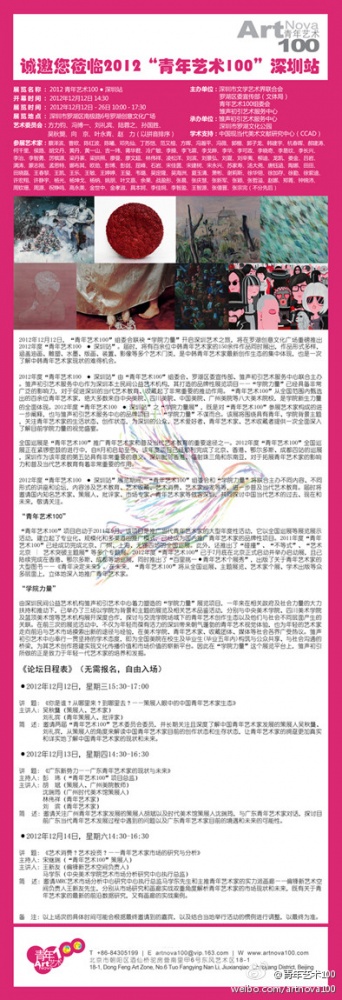 2012年度“青年艺术100”•深圳站展览期间,“青年艺术100”组委会和“学院力量”将联合主办不同内容、不同形式的讲座和论坛,内容涉及艺术教育、艺术收藏、艺术消费、艺术家沙龙等等,进一步普及当代艺术教育。届时将邀请国内知名艺术家、策展人、批评家、市场专家、青年艺术家等做客深圳,共同探讨中国当代艺术的过去、现在和未来,敬请关注。
