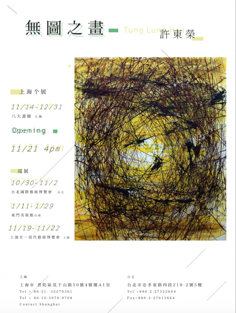 一直以來藝術創作是藝術家許東榮的生存動力和信仰,中國傳統文化神話和廟宇建築的造型顏色是他的繪畫和雕刻的主要靈感來源。從許東榮的最新繪畫系列“無圖之畫”和雕刻的“大象無形”可見一斑。無圖之畫系列里的作品“無線”和“草書”運用了道教“符”咒的色彩,以及中國草書的意境,但却是无法遍读的个人符号。画面筆觸充滿生命的張力,如一個撕裂的瞬間,一聲劃破寧靜的高音。