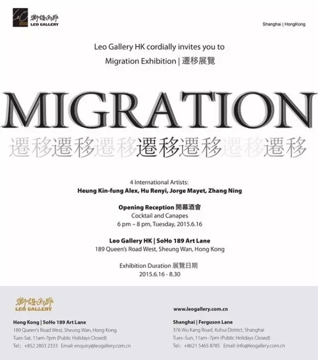 二零一五年六月十六日 – 狮语画廊将呈献四位国际艺术家的联展。艺术家香建峰、胡任乂、荷亥‧梅耶、张宁, 创作媒介多样,作品主题横跨身分、真实性及现代性。每位艺术家根据自身的迁徙经历,以独特视觉语言探讨这一系列议题。他们将共同探究在现代穿梭于不同地域与文化间所牵涉的「替代」与「迁移」的意义。