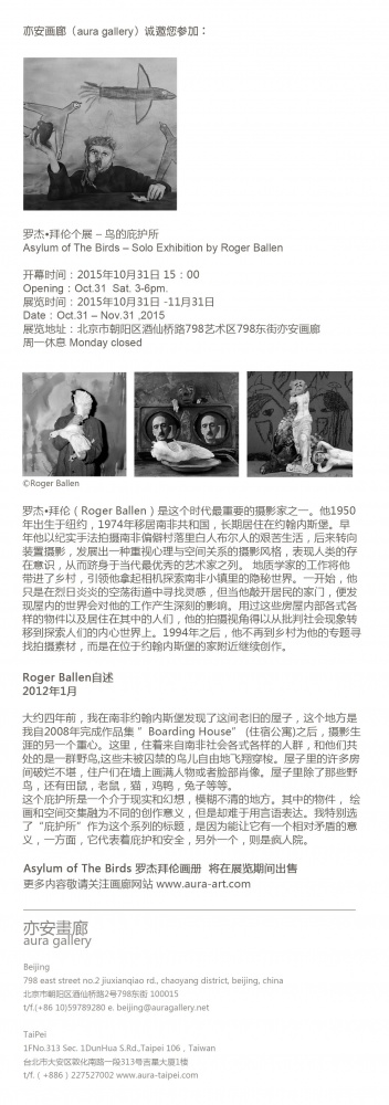 罗杰·拜伦(Roger Ballen)是这个时代最重要的摄影家之一。他1950年出生于纽约,1974年移居南非共和国,长期居住在约翰内斯堡。早年他以纪实手法拍摄南非偏僻村落里白人布尔人的艰苦生活,后来转向装置摄影,发展出一种重视心理与空间关系的摄影风格,表现人类的存在意识,从而跻身于当代最优秀的艺术家之列。 地质学家的工作将他带进了乡村,引领他拿起相机探索南非小镇里的隐秘世界。一开始,他只是在烈日炎炎的空荡街道中寻找灵感,但当他敲开居民的家门,便发现屋内的世界会对他的工作产生深刻的影响。用过这些房屋内部各式各样的物件以及居住在其中的人们,他的拍摄视角得以从批判社会现象转移到探索人们的内心世界上。1994年之后,他不再到乡村为他的专题寻找拍摄素材,而是在位于约翰内斯堡的家附近继续创作。