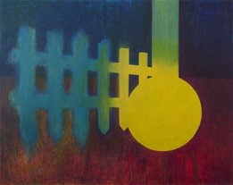 周思维的绘画灵感往往是先前已存在的、兼具色彩与形态的作品,包括标识或者其他的设计。比如作品气泡01(2014,布面油画,200 x 250 cm)和气泡02(2014,布面油画,180 x 140 cm)都是基于电脑数码绘画指南创作而成。栅栏(夕阳/倒置)(2014,布面油画,200 x 250 cm)也同样是基于栅栏的电脑绘图,而沙丘(双重/竖)(2014,布面油画,180 x 140 cm)和信封(2013-2014,布面油画,180 x 140 cm)则是基于沙丘和信封的示意图而作。周思维说他之所以对示意图的描绘感兴趣是缘于它们对观者的影响。在伊曼纽尔·康德看来,图解扮演着感知和理性之间的先验主义链接的角色,联结着悟性、感性和理性。康德所指的并不是示意图,而是也恰好用“图解”这一概念来描述人的大脑如何加工、重组信息从而制作出范式图。然而,他的定义有助于人们理解示意图设计的暧昧性。示意图兼具抽象和具象特征。它并没有刻画某个特定的栅栏,而是一个与栅栏相关的符号。从这个意义上来说,相比具体的视觉印象范畴,它更接近文字和语言,是一项标识着一组事物的抽象发明。周思维所参照的数码绘图指南并没有教人们如何绘制出某个特定的气泡,而是描绘通常意义的气泡。此外,沙丘看起来更像是一个关于沙丘的标识,只不过赋予了其夸张而又具代表性的形象。周思维认为这种极简、抽象的图像会给观者留下虚无和歧义,因为它和真实的感官世界之间的联系缺失了。更重要的是,艺术家选择用展示肖像照的方式纵向悬挂那些横向绘画,如此一来,只有当观者看到作品的标题并转过头来看,沙丘的形状方能被辨认。周思维同样将另外一件横向作品信封纵向悬挂,并将这一人们再熟悉不过的形象加以模糊处理,乍一看去,很难辨认。