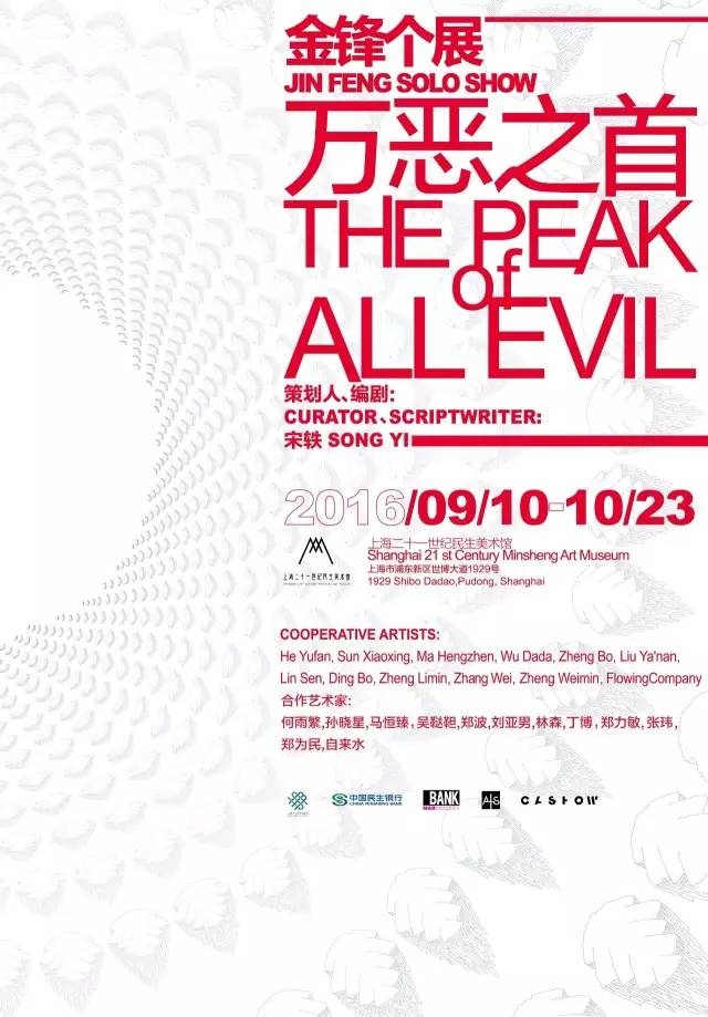 “万恶之首:金锋个展”展览包含了上海二十一世纪民生美术馆4块坡道展厅近1000平方米的影像、绘画、装置作品。此外,艺术家金锋邀请策划人宋轶,通过一场戏剧,共同对展场中的作品和艺术家本人进行“二次描绘”;并且,策划人根据对艺术家创作思考的理解,在这个大型个展的内部(高12米、600平方米的核心筒展厅内)筹划、编导了一个与展览主题相关的独立表演项目。
