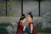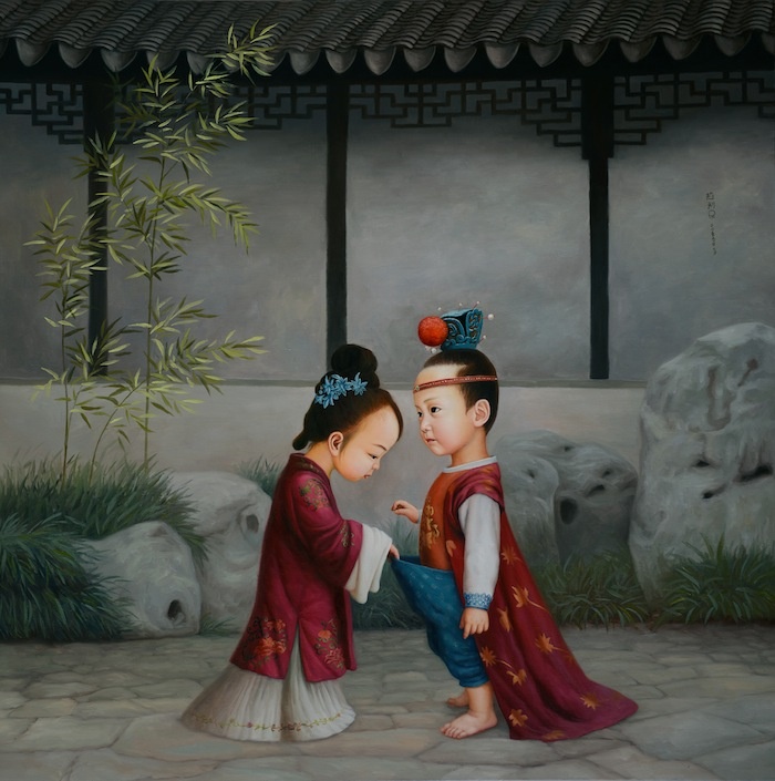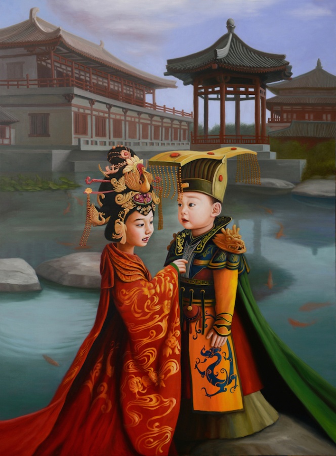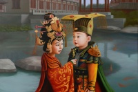 与气质敏感忧郁又极度理想化的朴吉友的作品大相径庭,艺术家赵利民的作品总在以最美好的方式捕捉制度生活的乐趣,既荒诞又真实,充满了隐喻。我们在赵利民此次个展《皇上驾到》的作品中看到的是一个超现实的世界,一系列虚幻的古代场景,一个个天真无邪的儿童,和一场场模仿成人世界的角色扮演的游戏,在他的笔下儿童几乎没有不可逾越的边界,但古代社会的场景却是一个别具讽刺意味的界限,艺术家借此刻意制造了时间、空间与心理上的局限,将作品的内容引向历史,引向过去,引向了所有人的童年。