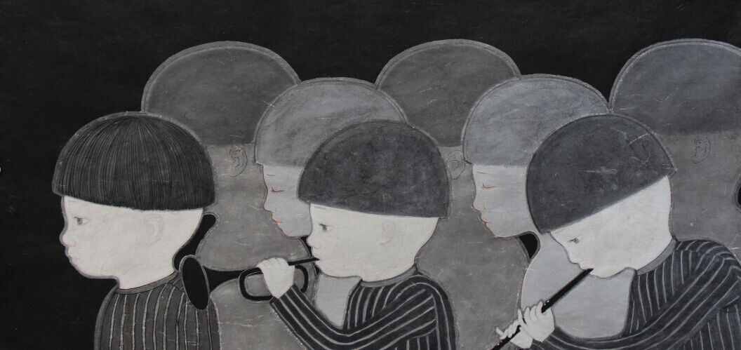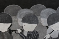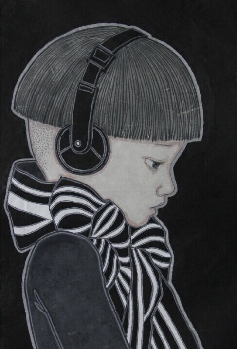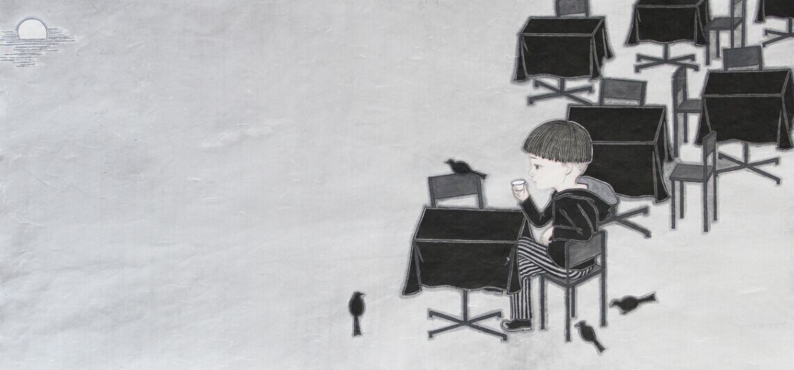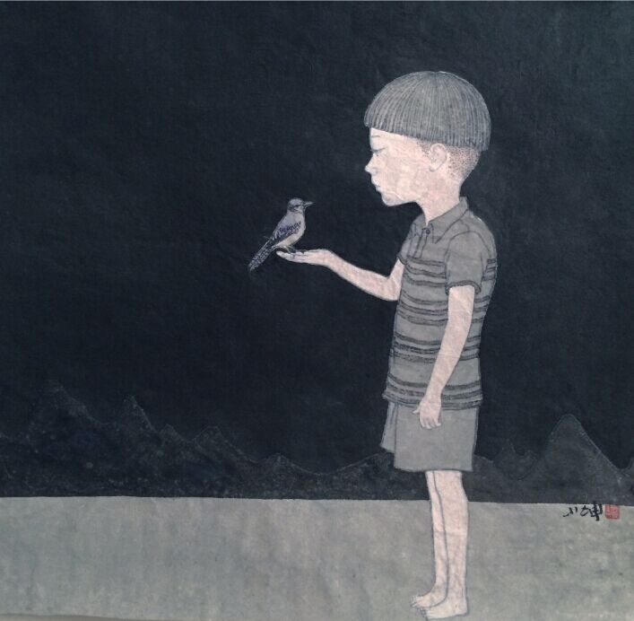 在2013年以前,朱小坤的创作主要强调自我表现,追求书写感、运笔地气息,结合运用西方表现主义,将忧伤、焦虑、不安、恐惧甚至愤怒等情绪植入到画面中并放大,在内心的基础上往外生发,力求表现张力。不过到了2014年,在儿童为主要题材的系列创作中,作品的整体面貌发生了质的变化。不仅结构布局整齐,用色与物体描写也和谐了很多。当然,这一重大转变来源于人生角色的调整,以及随之而来的心理调适。刚过而立之年的朱小坤,转眼儿子也两岁了,对孩子的满腔热爱,使得他将笔墨更多地集中在了儿子身上。而过去那种艺术表现方法用在纯真可爱的孩子身上,显然是不妥的,于是他开始努力往回收。以前在表现上具有更多偶然性,但2014年儿童题材系列中却力求在笔墨、情绪、张力上克制,对构图、造型、墨色推敲更多,气质更柔软。在色彩方面,他也几乎把所有颜色都剔除了,大面积地使用黑白灰的同时突出人物,压缩小细节,让背景更加单纯,让人不会注意到天空、山、树、草的颜色,更多固定在一个简单的形态上。过滤后的画面,全部为营造整体氛围服务,画面的效果也更为整体和单纯。