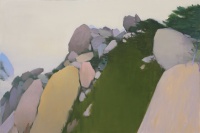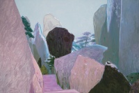 作为一个厝居在城市的望乡人,更出于对乡土的深深眷恋,他在从事艺术创作时,经常会将来自家乡的丽山秀水转换成一幅幅充满诗情画意的作品。在近来的通话中,我曾问及画家,为何如此钟爱家乡的田园,他告诉我,他喜欢贯穿于中华文化史中的“天人合一”思想,因为其强调了人与自然的高度和谐,而家乡的田园在他的画中只是表达这一理想的文化符号。在他看来,一些人在“现代化”的目标下追求过度发展时,对自然采取了无止境的开采,结果不仅大伤了自然的元气,也使人类自己受到了难以弥补的伤害。基于此,他希望用作品提示人们:人类离不开自然,也离不开家园,如果我们再不珍惜自然与家园,人类将无以生存。这些年不断出现的雾霾、沙尘暴与洪涝灾害就充分说明了这一点。再从另外的角度看,他也将家乡的田园当成了排除都市重压,寻求精神超越的地方。很明显,这与古代艺术家画山水或田园在本质上是一致的。据我所知,李诗文虽然是学油画的,但也常常着手于水墨画创作,于是也使他的油画中具有了水墨的韵味。从取材上看,他显然已经形成了自己的入画标准和意境构成方式,那山、那水、那树、还有那农舍……既来自于生活,又高于生活,进而变成了艺术家虚拟的境界,显得既纯真朴实、宁静清澄,也有力强调了他的价值观和生活态度;从艺术表现上看,他在借鉴大卫·霍尼克的同时,又成功地超越了这位西方大艺术家的程式表现规范,以致成功地把来自家乡的田园景色转换成了具有个人特点的形式符号。正如大家所看到的那样,他作画喜欢用大的色块,而且很注意构成的关系。一般来讲,他总是喜欢用纯度极高的色,画面则显得雄浑苍然、翁郁葱茏、概括大气。