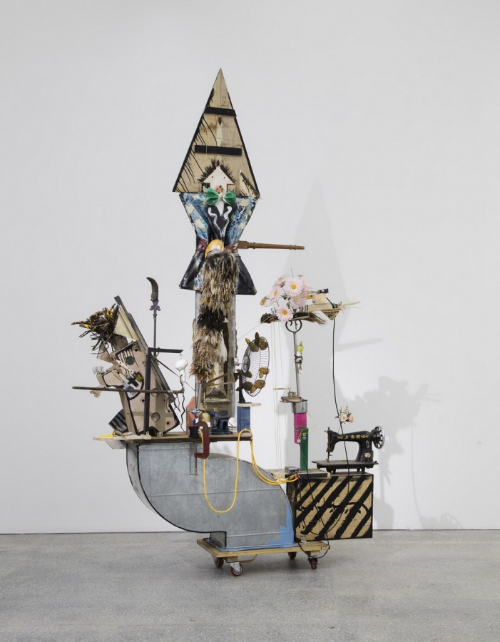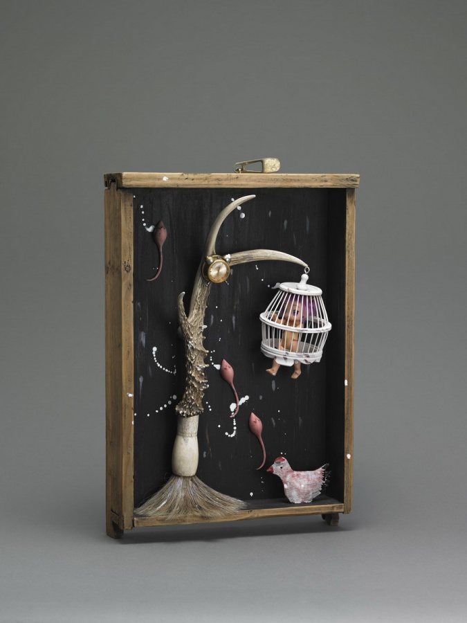 本次大展,陈庆庆带来了混合材料装置作品《找达利吧!》。这是一件以一只旧抽屉为主材的作品,鹿角上的闹钟、笼子里的娃娃,营造出一带有奇幻色彩的场景。陈庆庆表示:“抽屉和每个人都是有关系的,家家有抽屉,有历史的记忆在里面,我之所以这样创作,是因为在我看来,艺术和人应该有一种很亲近的关系,我从生活出发,作品不见得很美,但一定是很感人。我以前想说故事,一件作品想要讲一个完整的故事或者现状,现在想呈现的是一个局部,会把一些具体的东西放大,更清晰。”