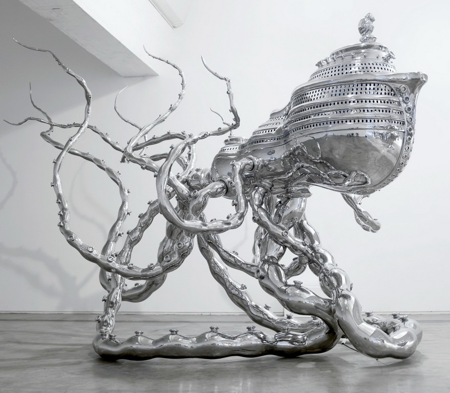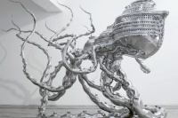 本次大展,苍鑫带来了新近创作的机械装置作品——《巫术中的人工智能》。展出的一对装置,包含了一个可移动的解构,其上两条银黑色巨龙相互咬尾,一只似公、一只似母。作品在外观上与罗马梵蒂冈博物馆内《拉奥孔和他的儿子们》中缠绕躯体的海蛇有着几分相似,这里的两条巨龙也在方体基座上呈环行姿态扭动。