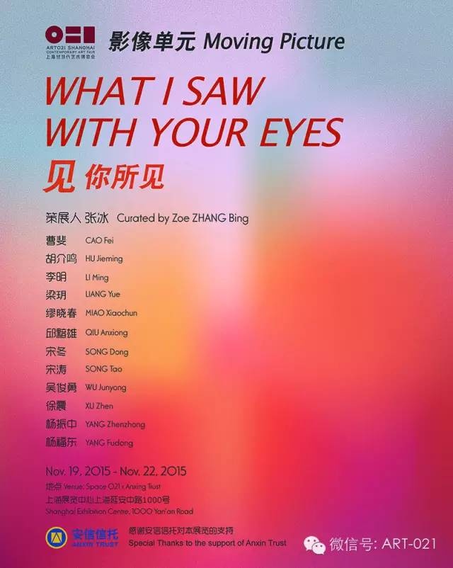 11月19日至11月22日在ART021现场将为大家呈现安信信托与ART021的特别展览: ART021 x Anxing Trust影像单元,“What I Saw With Your Eyes 见你所见”影像群展。展览由张冰策划,参展的有曹斐、胡介鸣、李明、梁玥、缪晓春、邱黯雄、宋冬、宋涛、吴俊勇、徐震、杨振中、杨福东等12位具有代表性的艺术家。通过参与本次的赞助活动,安信信托让更多艺术领域的专业人士看到其对当代艺术方面的支持,同时作为肩负社会责任的上市金融企业,从艺术层面回馈社会并为人们提供一种视觉和精神上新的观赏与思考的角度。