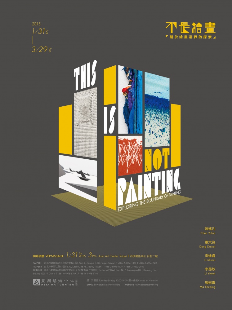 亚洲艺术中心于2015/1/31在台北二馆展出《不是绘画—关于绘画边界的探索》,聚集五位各具风格及备受国际瞩目的中国当代艺术家-陈彧凡、董大为、李姝睿、李易纹和马树青,展览旨在探讨「绘画」在当代语汇中的各种可能性,将绘画延伸和再阐释,「绘画」不单纯是「绘画」,但也是「绘画」,也许是突破二维空间的载体、抑或是方法论的转变,挑战观看的姿态、推展绘画的界线。