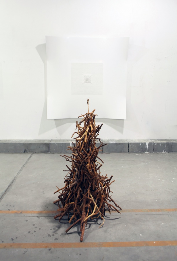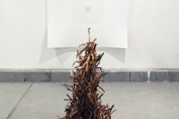 陈彧凡也试图挑战在二维平面中创造三维空间,作品《信仰》通过按压的方式制造出规律的圆点,每个圆点可被视为是微小的独立空间。龙眼树枝则是艺术家家乡的代表植物,面对因乡村改造而将逝去的家乡样貌,此植物象征了群体向上挣脱的复杂情绪,装置和绘画之间形成极具意味的对话。