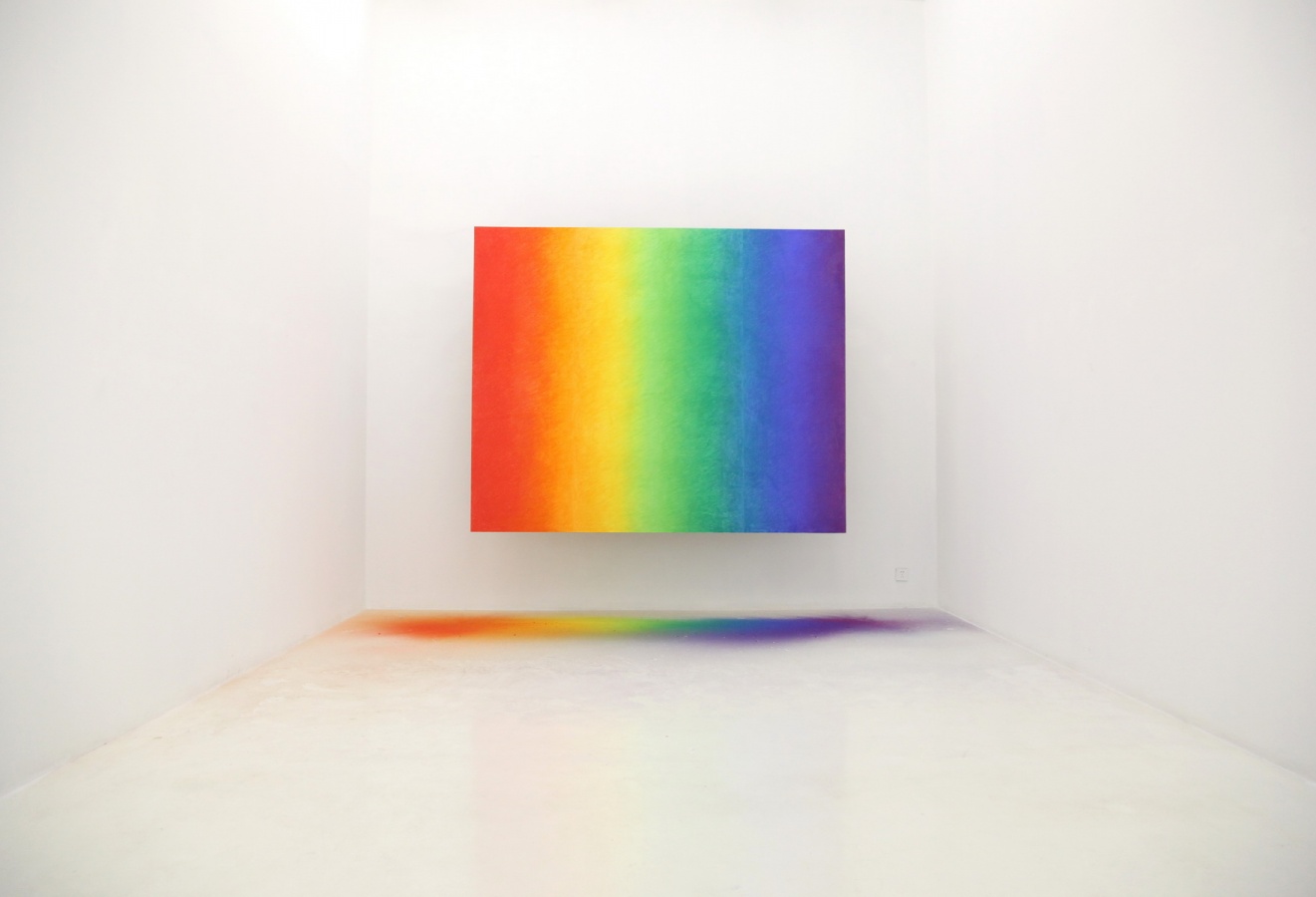 在「光」系列中,艺术家经由喷枪制造五颜六色的斑点,强烈的色彩交织使观者必须保持一段距离方能直视,使「光」存在于画布前的空间,拓展了视觉感知的界线,创造了一种全新的绘画形式。