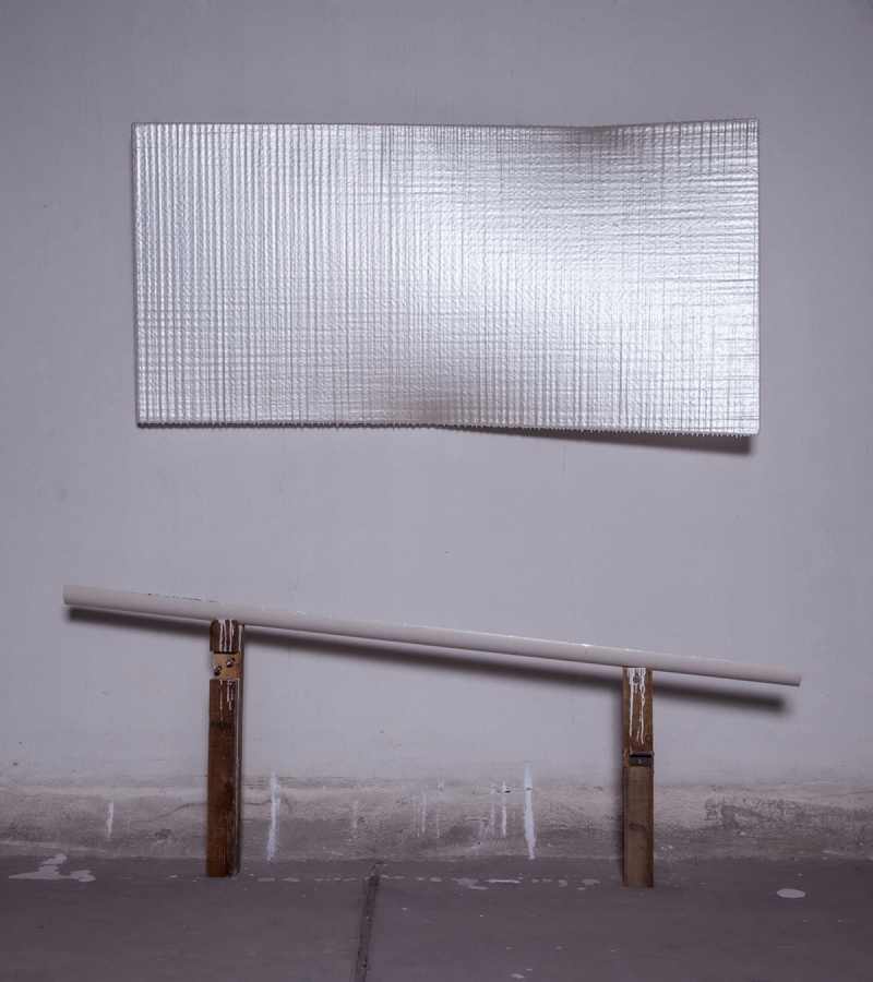 《衍生物》是艺术家在不规则画布上反复滴流颜料所产生的十字纹理效果,时间被凝结在画布之上,倾斜的管桶装置是创作时用来收集滴淌的颜料,再将其重复利用在画布上,作品生成的过程赤裸裸展现于我们眼前。