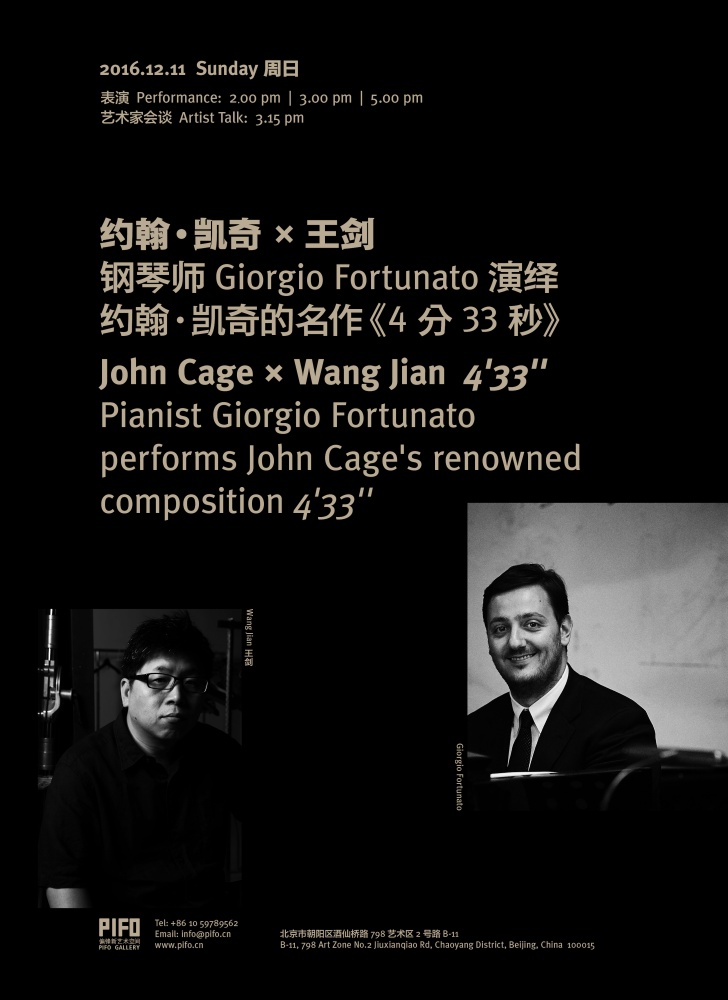 12月11日,为响应艺术家王剑在北京偏锋新艺术空间个展的作品,意大利钢琴师Giorgio Fortunato将重新演绎实验作曲家约翰·凯奇开创性的名作《4’33”》。 以东方哲学和抽象极简画家罗伯特·劳森伯格为灵感,以三个动作完成四分三十三秒持久的静默, 凯奇的这一作品成为他最具争议的先锋乐章之一。表演分别开始于12月11日周日下午2时、3时和5时,3时场之后会举办一场由偏锋新艺术空间总监杨大宇主持、艺术家和演奏者之间的会谈活动。
